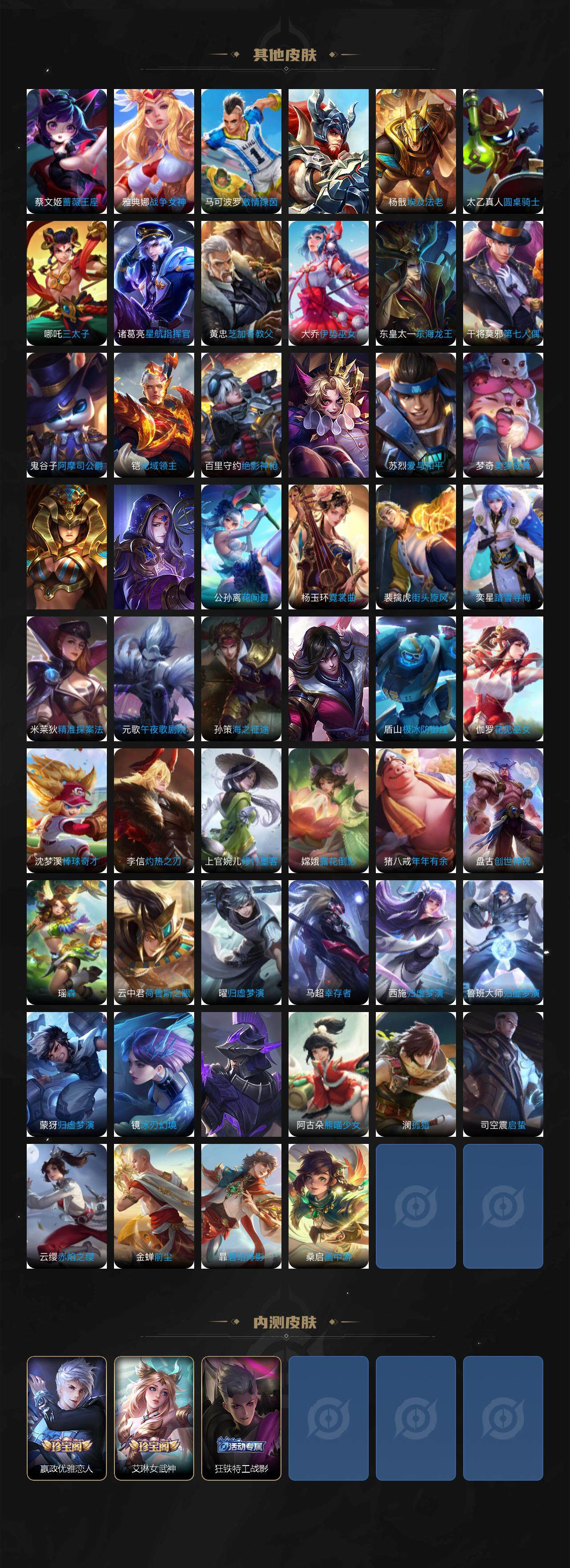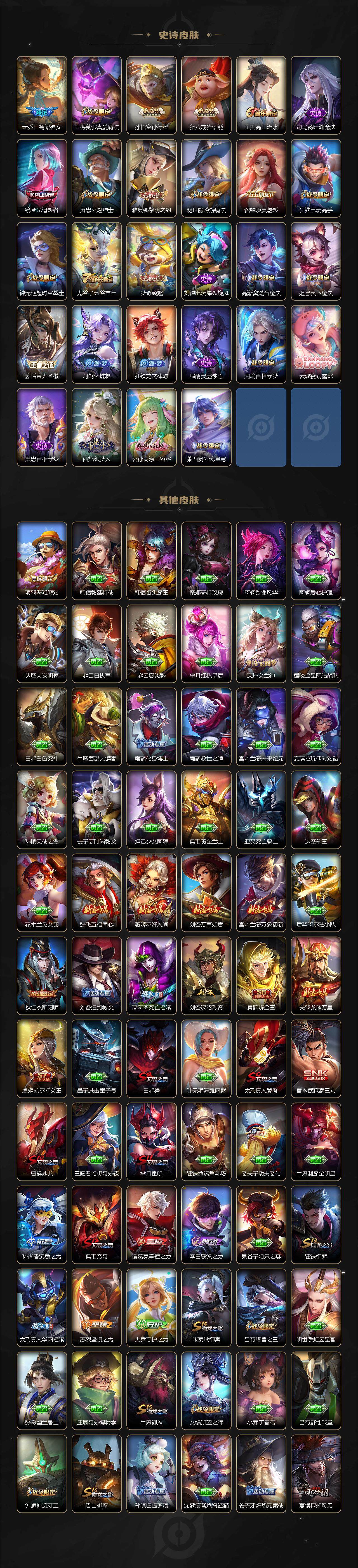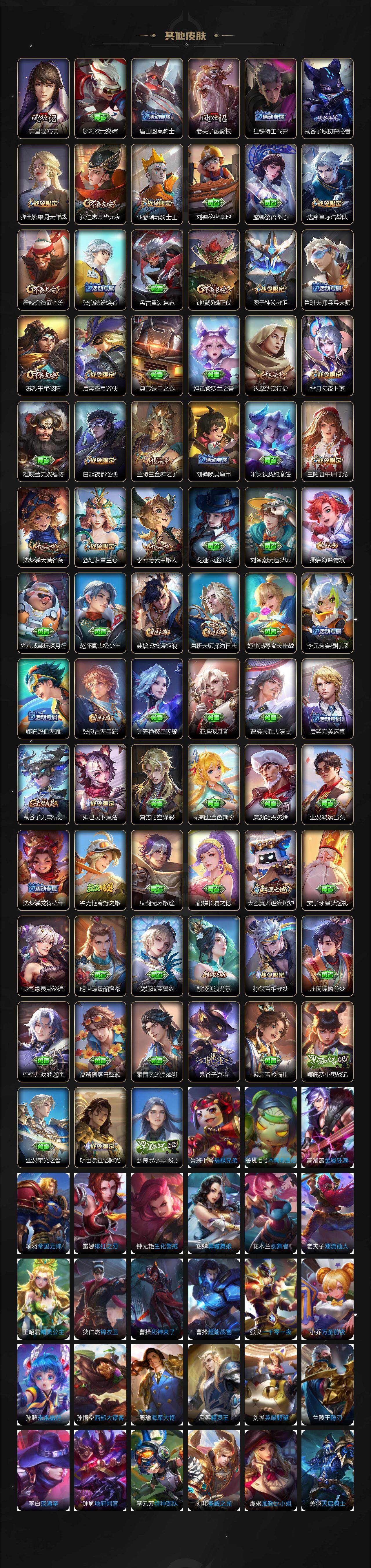 扁鹊炼金王,虞姬凯尔特女王,白起狰,太乙真人饕餮,曹操烛龙,芈月重明,典韦穷奇,狂铁御狮,米莱狄御霄,牛魔御旌,盾山御銮,夏侯惇朔风刀,老夫子醍醐杖,鬼谷子原初探秘者,狄仁杰万华元夜,程咬金演武夺筹,钟馗驱傩正仪,苏烈千军破阵,吕布猎兽之王,嬴政白昼王子,女娲朔望之晖,典韦蓝屏警告,钟馗神迹守卫,鲁班七号狮舞东方,蒙犽狂想玩偶喵,元歌云间偶戏,弈星混沌棋,达摩沙漠行僧,兰陵王金庭之子,沈梦溪大漠名商,李元芳云中旅人,桑启海盐诗旅,裴擒虎擒涛扼浪,鲁班大师探海日志,张良古海寻踪