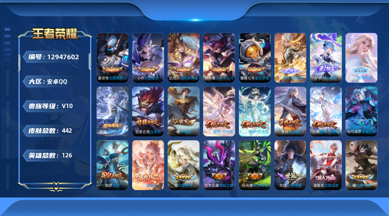 [12947602]【暑期末清货/特价急出/永久包赔】:安卓Q-V10-最强王者段位-126英雄-442皮肤-5典藏-3无双-1珍品传说-40传说-137史诗