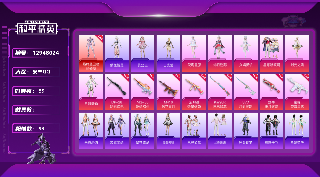 - PX_2093503- 安卓手Q-3王牌印记-8粉装-4特效枪-1载具-40961热力值-102套装-117枪皮-0卓越印记-0传奇印记 【8粉装】,花灵,宁雨蝶,雪月幻音,羲和光序,女娲灵识,天之羽翼,雪梅暗香,玄冥寒域 【4特效枪】AKM-星际浪客-7级 M416-女娲灵识-3级 Kar98K-巳巳如意-5级 MK12-雪月幻音-4级 【2稀有紫装】,暗影哥特,浪漫天命, 【1稀有载具】,宝