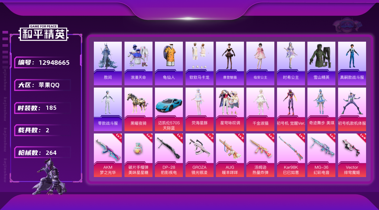 - [14011494]安卓 手Q-无敌战神框-2神装-53粉装-18特效枪-9载具-8粉色飞行器-141512热力值-12王牌印记-242套装-267枪皮 【红色载具】:宾利飞驰(皇家紫)(一级) 【红色神装等级】:精灵之光-露米娜(二级),角色-青焰关公(一级) 【红色角色神装】:精灵之光-露米娜,角色-青焰关公 【热门品类】:粉装-怪诞乔克,粉装-雪国幻梦,粉装-梦幻火箭,粉装-童趣迷兔,粉装-缤纷油彩,粉装-彩装战姬,套装-赤蝎幽灵,套装-都市猎人,套装-派对舞王,套装-深海小丑鱼,套装-小丑鱼,套装-胖达团团,套装-胖达圆圆,角色-忠猛周仓,角色-忠真马岱,角色-忠义严颜,套装-龟仙人,套装-暗影哥特,套装-糯粉咩咩,小丑红鼻头,大砍刀-青龙偃月刀,撬棍-龙胆亮银枪 【粉色载具】:宾利欧陆GT敞篷(火焰橘),宾利飞驰(皇家紫),仰望U7(阿盖尔紫),帕加尼imola(光影红),合金龙骨(绿),萌喵橘座,僚机-萌兔起飞,赤兔,照夜玉狮子,星梦玉骢 【粉色套装】:粉装-怪诞乔克,粉装-甜心巧克力,粉装-宝贝奶油派,粉装-天使彩虹糖,粉装-雪国幻梦,粉装-梦幻火箭,粉装-缤纷油彩,粉装-放客神游,粉装-星空之魅,粉装-花间之火,粉装-冰霜白皇,粉装-童趣迷兔,粉装-炙焰红王,粉装-馨动时刻,角色-洛天依,粉装-焦糖拿铁,粉装-恐龙拽拽,粉装-橘柚倾心,粉装-甜梦小狐,粉装-暖熊萌萌,粉装-灵感创作师,粉装-彩虹甜喵,粉装-旋转彩虹,粉装-冰川粉黛,粉装-冰川幽秘,粉装-冰川红玫,粉装-银红美神,粉装-霞光圣骑,粉装-寒光使者,角色-歌者泠鸢,粉装-暗夜鎏金,粉装-第五大道,粉装-纯珍童话,粉装-仲夏莫吉托,粉装-飒粉甜心,角色-白勺歌姬,角色-呆萌星弥,角色-小可学妹,粉装-萌物绒绒,角色-宙之时溯,角色-星云暗核,粉装-莲影清波,粉装-彩装战姬,粉装-憨憨奶龙,角色-圣堂之誓,角色-小叽联名款,玩偶服-猪猪侠,角色-烟云彩露,角色-严莉莉,角色-小蓝,角色-美琪,粉装-金丰海韵,粉装-星穹咏叹调 【粉色枪皮等级】:AKM-星际浪客(四级),AKM-魔法神域(六级),SCAR-L-万古烈焰(八级),SCAR-L-时空协奏(三级),M416-暖熊萌萌(三级),M416-超新星(九级),GROZA-旋转彩虹(一级),GROZA-精灵之光(五级),M762-电糖天使(四级),UMP45-相