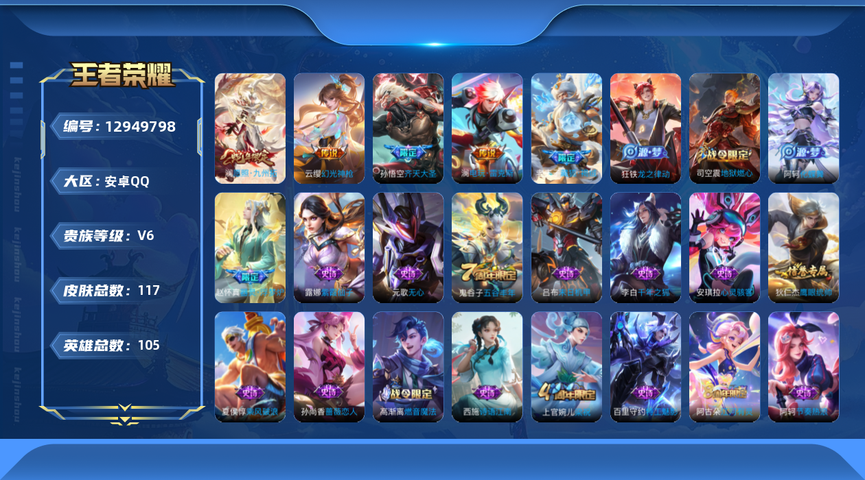 [12949798]【特价急出/详情看图】:安卓Q-V6-永恒钻石V段位-105英雄-117皮肤-4传说-34史诗