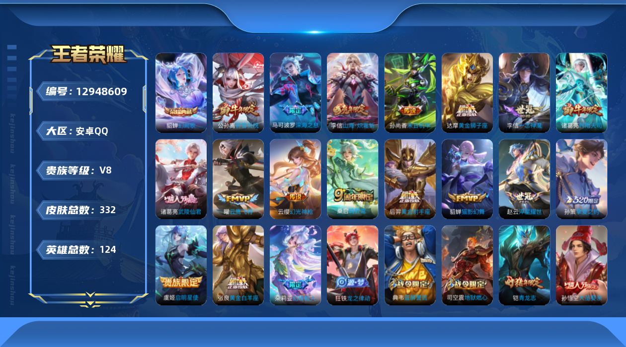 [12948609]【特价急出/详情看图】:安卓Q-V8-尊贵铂金II段位-124英雄-332皮肤-1典藏-17传说-88史诗