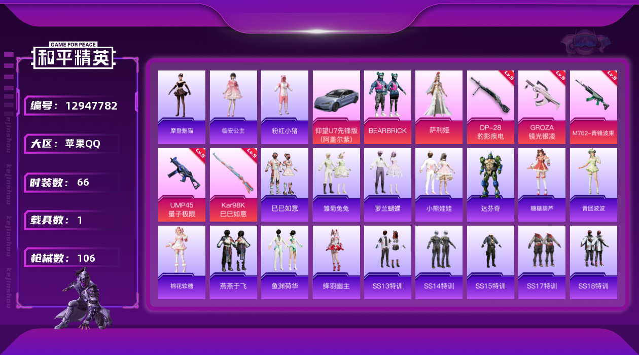 [12947782]绝世印记1【暑期末清货/特价急出/永久包赔】:苹果 手Q-2粉装-5特效枪-1载具-3.2w热力值-5印记-66套装-106枪皮【稀有载具】:仰望U7(阿盖尔紫)【特效枪等级】:GROZA-镜光银凌(五级),M762-青锋波束(五级),UMP45-量子极限(五级),Kar98K-巳巳如意(五级),DP-28-豹影疾电(五级)【优质套装】:粉装-BEARBRICK,角色-萨利娅