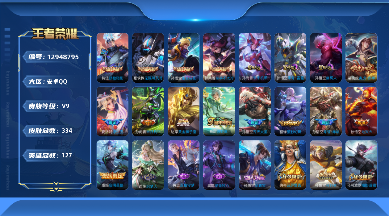 [12948795]【特价急出/详情看图】安卓Q-V9-至尊星耀IV段位-127英雄-334皮肤-4典藏-10传说-94史诗