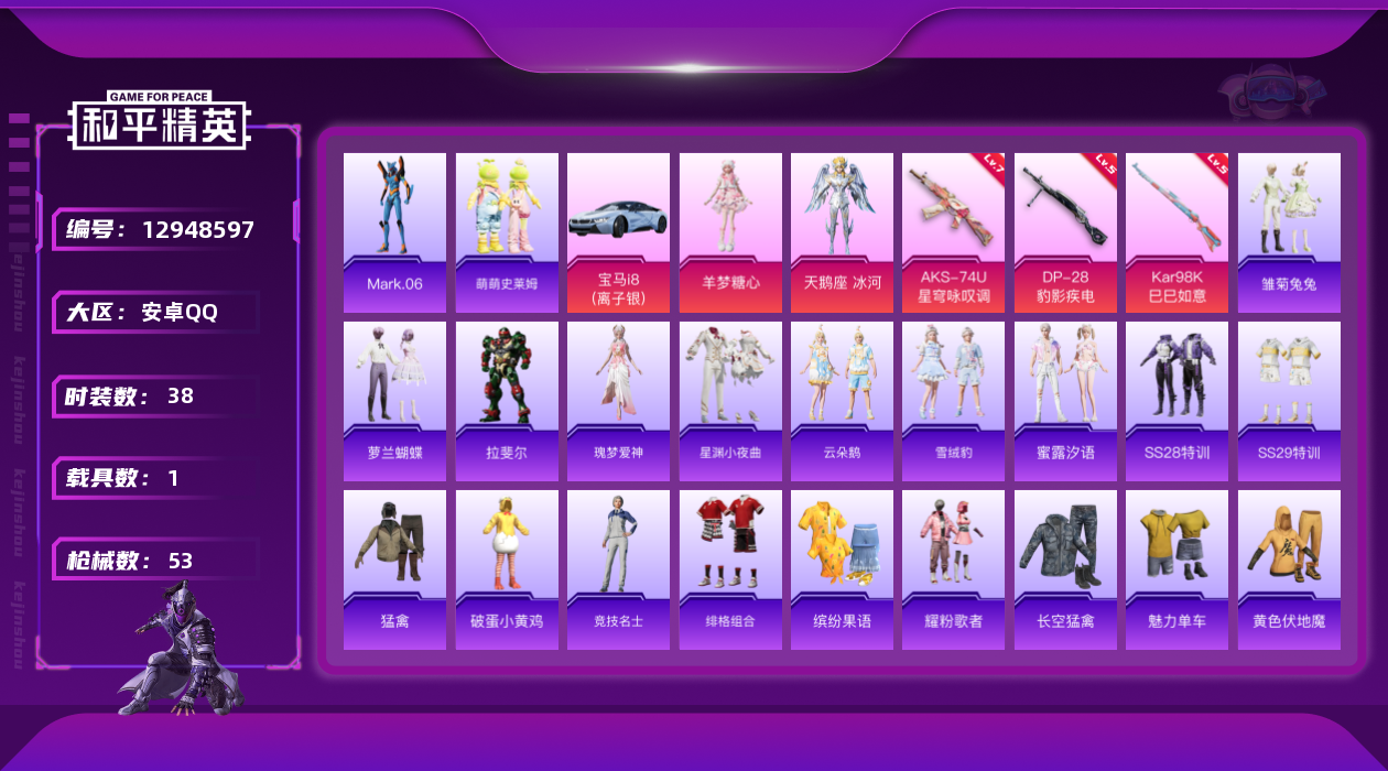 [12948597]【特价急出/详情看图】:安卓 手Q-2粉装-3特效枪-1载具-1粉色飞行器-1.8w热力值-7王牌印记-38套装-53枪皮【热门品类】:角色-Mark.06【粉色载具】:宝马i8(离子银)【粉色套装】:角色-天鹅座 冰河,角色-羊梦糖心【粉色枪皮等级】:AKS-74U-星穹咏叹调(七级),Kar98K-巳巳如意(五级),DP-28-豹影疾电(五级)【粉色飞行器】:凤舞九天飞行器