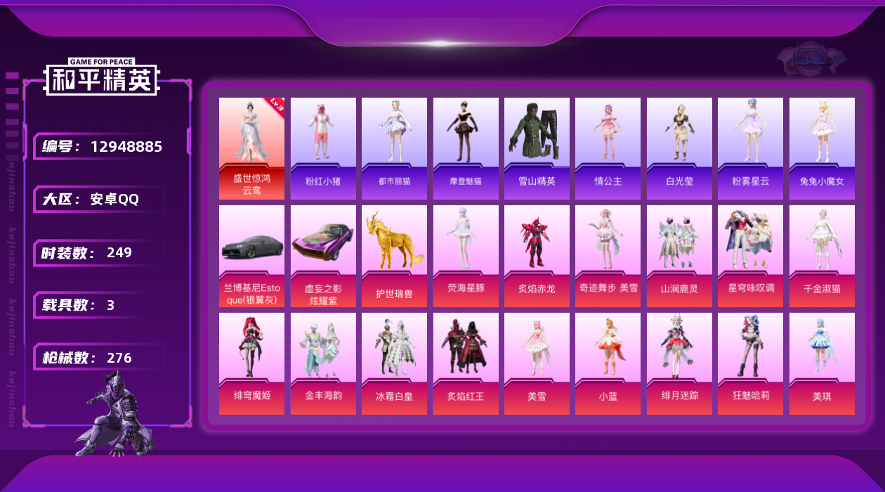 [12948885]【特价急出/详情看图】:安卓 手Q-1红装-22粉装-5特效枪-3载具-8粉色飞行器-10.2w热力值-20王牌印记-249套装-276枪皮【红色神装等级】:盛世惊鸿-云鸾(三级)【热门品类】:粉装-梦幻火箭,套装-SS1特训,套装-粉红小猪,小恶魔头饰【粉色载具】:兰博基尼Estoque(银翼灰),虚妄之影(炫耀紫),护世瑞兽【粉色套装】:粉装-梦幻火箭,粉装-冰霜白皇,粉装-炙焰红王,粉装-王牌四分卫,粉装-炙焰赤龙,粉装-暗夜玫瑰,粉装-山涧鹿灵,粉装-齐天大圣,角色-严莉莉,角色-小蓝,角色-美雪,角色-美琪,粉装-金丰海韵,角色-千金淑猫,粉装-星穹咏叹调,角色-狂魅哈莉,角色-绯月迷踪,角色-荧海星豚,角色-绯穹魔姬,角色-奇迹舞步 贝贝,角色-奇迹舞步 美琪,角色-奇迹舞步 美雪【粉色枪皮等级】:Vector-绯穹魔姬(四级),P90-金丰海韵(七级),Kar98K-巳巳如意(五级),DP-28-千金淑猫(五级),DP-28-豹影疾电(五级)【粉色飞行器】:酣梦熊熊飞行器,梦幻火箭飞行器,林间仙鹿飞行器,镜光幻境飞行翼,巴啦啦小魔仙飞行器,凤舞九天飞行器,万象金身飞行器,时光之吻飞行器