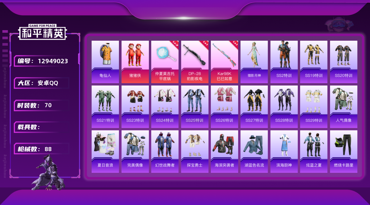 [12949023]【特价急出/详情看图】:安卓 手Q-1粉装-3特效枪-2.4w热力值-3王牌印记-70套装-88枪皮【热门品类】:套装-SS1特训,套装-龟仙人【粉色套装】:玩偶服-猪猪侠【粉色枪皮等级】:Kar98K-巳巳如意(一级),DP-28-豹影疾电(一级),平底锅-仲夏莫吉托(三级)