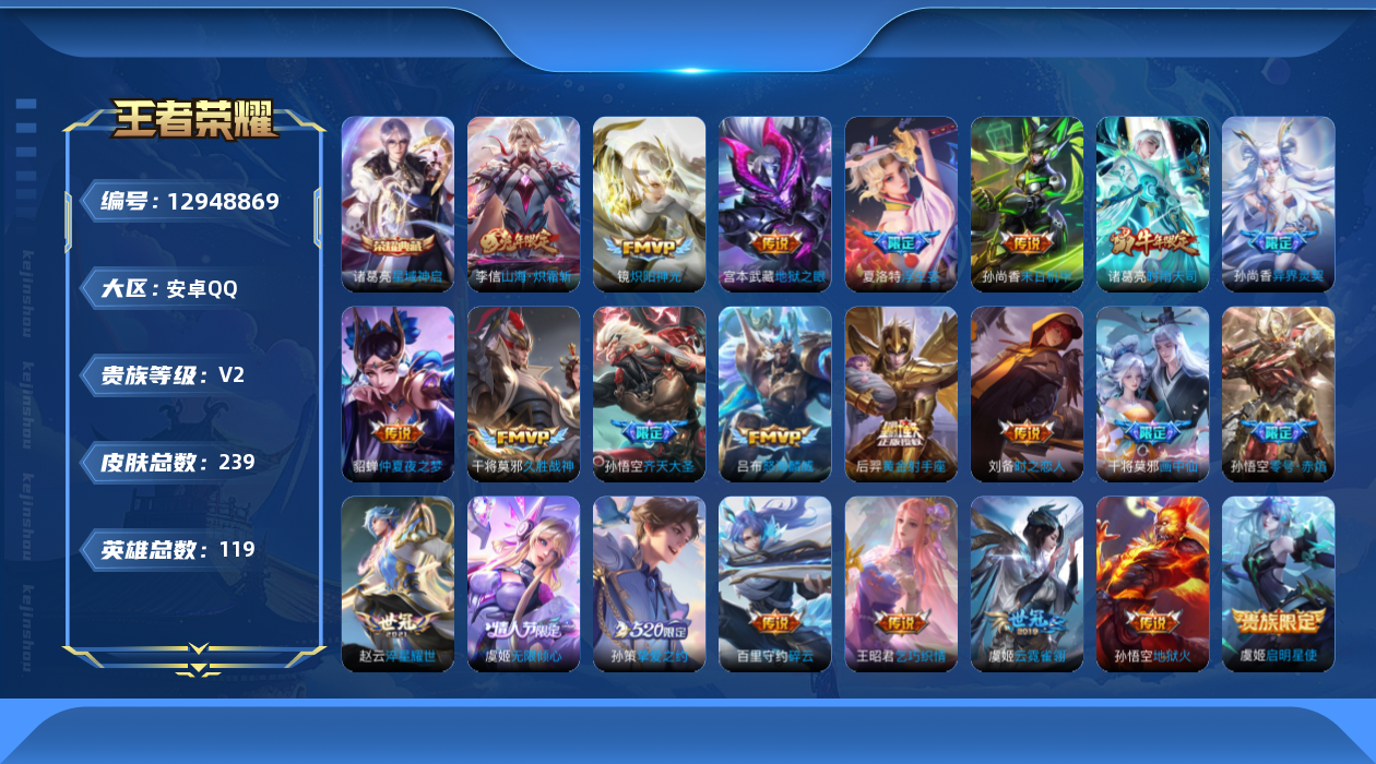 - [12082552]V10 5典藏 1无双 5珍品传说 47传说 126英雄 475皮肤 典藏英雄武则天 可修改实名 优质装备:杀手不太冷,鸣剑·曳影,全息碎影(猴子典藏),赤影疾锋,碎月剑心(李白无双),神鉴启示录,江户川柯南,怪盗基德,朽木白哉,黑崎一护,黄金狮子座,黄金射手座,冠军飞将,云鹰飞将(小将军),黄金白羊座,猫影幻舞,久胜战神,炽阳神光,一念神魔,云霓雀翎,末日机甲-孙尚香(绿蚂蚱),地狱火,仲夏夜之梦(大飞蛾),音你心动-小乔,零号·赤焰,海洋之心,地狱之眼,飞鸢探春,胖达荣荣,乞巧织情,时之恋人-刘备(电焊工),游龙清影(小青龙),淬星耀世,超时空战士-狄仁杰,遇见胡旋,末日机甲-孙策,挚爱之约,无双飞将,山海·琳琅生(小乔年限),鹤归松栖(云缨),澜逐花归海,艾琳觅芳踪,玄雷天君,涂山容容 珍品传说:时之奇旅-孙策 传说皮:幻光神枪 珍宝阁皮:万物之道,蔷薇恋人,玩趣恶龙 限定皮:愿照·千秋盛(女娲年限),逐霄战戟,鸣野蒿,至尊宝,白虎志(电光耗子),凤求凰(白切鸡),凤凰于飞,太华(伽罗年限),梅西,补天,绯月行,时之彼端,白晶晶,时雨天司(水龙头),神威(电光马子),飞衡(韩信年限),玄嵩(庄周年限),遇见飞天,高山流水,匿光决锋者,五谷丰年,青龙志(铠年限),冰锋战神,幽恒(沐浴露),天狼运算者,梁祝,御风骁将(吕布年限),逐梦之翼,岱宗(典韦年限),天狼溯光者,天狼征服者,奔雷神使(牛魔年限),祈雪灵祝(雪兔子),逐梦之影,逐梦之光,玄武志(苏烈年限),朱雀志(守约年限),永曜之星,辉光之辰,如梦令-后羿,奇迹圣诞,默契交锋-花木兰,真爱至上,孙行者,猪悟能,大圣娶亲,青春决赛季,冰霜恋舞曲,蜜橘之夏,热情桑巴,神奇女侠,美猴王,寅虎·赤拳(老虎年限),启示之音,唐三藏,神器·万象笔 史诗皮:鸭鸭历险记-刘禅,器灵·浮梦炉,狼魂孤将,化蝶舞,灵蛊蚀心,星界战将,龙之律动,雪豹·霜爪,石田雨龙,百相守梦-周瑜,茶境仙,破空之剑,百相守梦-百里守约,百相守梦-黄忠,遇见神鹿,紫霞仙子,苍穹之光,电玩小子(小书包),白龙吟,黄金分割率,特工魅影,千年之狐,永昼,江河有灵,末日机甲-莱西奥,鹤归松栖(赵怀真),雪夜绮愿(周瑜),魅语,百解令(蒙犽),高渐离燃音魔法,蒙恬荣光圣徽,无限星赏官,冰冠公主,青蛇,偶像歌手,白蛇,晚萤,暗夜猫娘,银翎春语,龙骑士(小龙