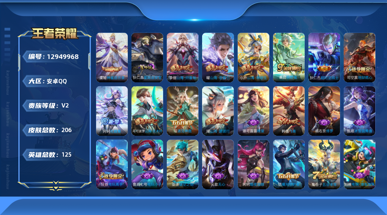[12949968]【特价急出/详情看图】安卓Q-V2-荣耀黄金II段位-125英雄-206皮肤-1典藏-5传说-60史诗 【荣耀典藏】:虞姬神鉴启示录 【传说皮肤】:桑启鸣野蒿,小乔山海琳琅生,曜山海苍雷引,李信山海炽霜斩,狄仁杰超时空战士 【限定皮肤】:蒙犽顽岩魄,姜子牙天穹之誓,杨戬破阵退雄兵,狄仁杰阴阳师,小乔山海琳琅生,赵云皇家上将,孙尚香蔷薇恋人,庄周高山流水,钟无艳超时空战士,扁鹊奇幻香踪,吕布猎兽之王,元歌无心,甄姬落雪兰心,马可波罗山海玄木吟,狄仁杰魔术师,达摩沙漠行僧,项羽海滩派对,韩信飞衡,王昭君午后时光,兰陵王金庭之子,亚瑟潮玩骑士王,李元芳云中旅人,钟馗神迹守卫,杨戬潮玩骑兵,鬼谷子五谷丰年,沈梦溪大漠名商,裴擒虎擒涛扼浪,狂铁电玩高手,瑶山海碧波行,云中君纤云弄巧,李信山海炽霜斩,嫦娥拒霜思,嫦娥暖冬兔眠,曜山海苍雷引,西施玲珑珍味,鲁班大师探海日志,桑启海盐诗旅,暃星界游侠,戈娅驭风魔法,艾琳女武神,艾琳流音漫舞,司空震地狱燃心,阿古朵江河有灵,张良古海寻踪,蒙犽百解令,高渐离燃音魔法,妲己灵卜魔法,鬼谷子天穹祈灯,沈梦溪龙舞盛年,鲁班七号蔬乡物语,李元芳蔬乡物语,刘邦剑破天穹,程咬金群星魔术团,镜青焰无极,项羽苍威无极,刘备异域游侠,周瑜熔金海岸 【年限皮肤】:韩信飞衡,瑶山海碧波行,马可波罗山海玄木吟,李信山海炽霜斩,小乔山海琳琅生,曜山海苍雷引 【赛季限定】:达摩沙漠行僧,兰陵王金庭之子,张良古海寻踪,李元芳云中旅人,沈梦溪大漠名商,裴擒虎擒涛扼浪,鲁班大师探海日志,桑启海盐诗旅,鬼谷子天穹祈灯,刘邦剑破天穹,姜子牙天穹之誓 【战令限定】:钟无艳超时空战士,扁鹊奇幻香踪,吕布猎兽之王,甄姬落雪兰心,王昭君午后时光,艾琳流音漫舞,亚瑟潮玩骑士王,钟馗神迹守卫,杨戬潮玩骑兵,狂铁电玩高手,嫦娥暖冬兔眠,西施玲珑珍味,司空震地狱燃心,暃星界游侠,戈娅驭风魔法,高渐离燃音魔法,妲己灵卜魔法,鲁班七号蔬乡物语,李元芳蔬乡物语,镜青焰无极,项羽苍威无极 【史诗皮肤】:鲁班七号电玩小子,阿轲暗夜猫娘,赵云皇家上将,赵云未来纪元,貂蝉圣诞恋歌,甄姬冰雪圆舞曲,狄仁杰魔术师,宫本武藏鬼剑武藏,孙尚香蔷薇恋人,孙尚香水果甜心,妲己魅力维加斯,妲己女仆咖啡,墨子金属风暴,吕布圣诞狂欢,刘禅绅士熊喵,李白千年之狐,吕布末日机甲,张飞乱世虎臣,花木兰水晶猎龙者,刘邦德古拉伯