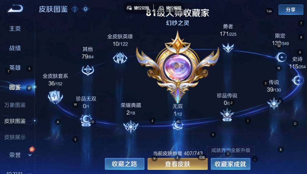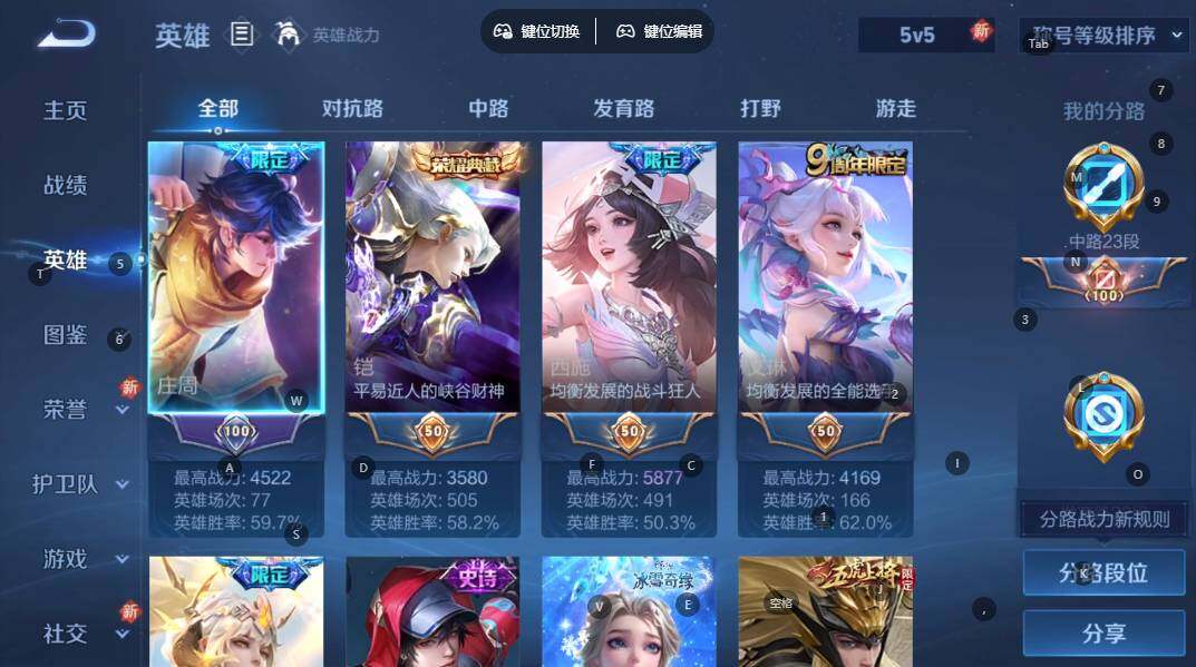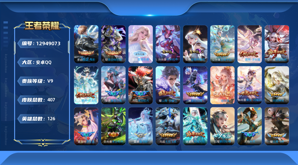[12949073]安卓Q-V9-至尊星耀V段位-126英雄-407皮肤-2典藏-3星传说-1无双-0珍品传说-39传说-115史诗
