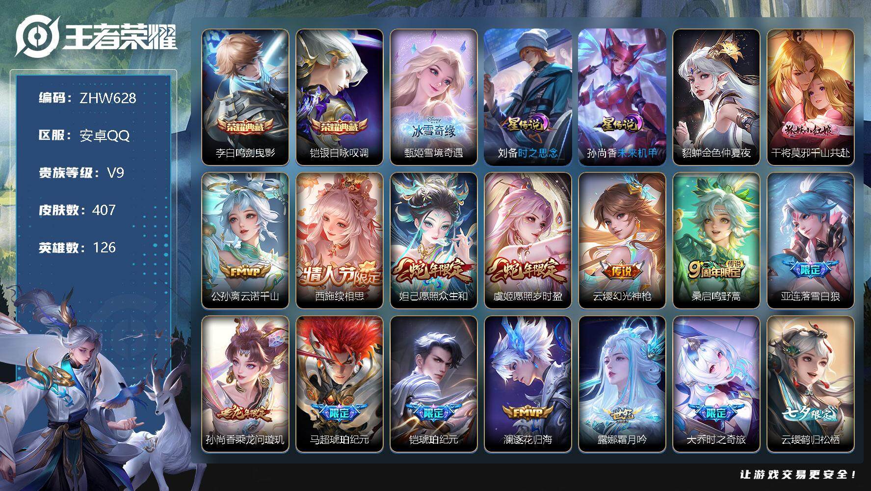[12949073]安卓Q-V9-至尊星耀V段位-126英雄-407皮肤-2典藏-3星传说-1无双-0珍品传说-39传说-115史诗 【英雄全皮】:孙权全皮,刘备全皮,钟馗全皮,马超全皮,西施全皮,蒙恬全皮,云缨全皮,赵怀真全皮,戈娅全皮,空空儿全皮 【荣耀典藏】:李白鸣剑曳影,铠银白咏叹调 【无双皮肤】:甄姬雪境奇遇 【传说皮肤】:干将莫邪千山共赴,公孙离云诺千山,西施续相思,妲己愿照众生和,虞姬愿照岁时盈,云缨幻光神枪,桑启鸣野蒿,亚连落雪白狼,孙尚香乘龙问璇玑,马超琥珀纪元,铠琥珀纪元,澜逐花归海,露娜霜月吟,大乔时之奇旅,云缨鹤归松栖,马可波罗妄想实况,诸葛亮鹤羽星尊,张飞百相守梦,公孙离记忆之芯,夏洛特浮生妄,花木兰燃星之曲,伽罗炽翼辉光,孙悟空齐天大圣,曜山海苍雷引,不知火舞绯月行,孙尚香音你闪耀,马超无双飞将,露娜启示之音,女娲补天,西施游龙清影,公孙离祈雪灵祝,诸葛亮时雨天司,镜炽阳神光,虞姬启明星使,曜云鹰飞将,刘备时之恋人,虞姬云霓雀翎,貂蝉仲夏夜之梦,孙尚香末日机甲 【限定皮肤】:蒙犽顽岩魄,蔡文姬夏日便利店,大乔绒语心约,虞姬夏日便利店,姜子牙天穹之誓,杨戬破阵退雄兵,狄仁杰阴阳师,赵云皇家上将,赵云引擎之心,孙尚香蔷薇恋人,庄周云端筑梦师,钟无艳超时空战士,扁鹊奇幻香踪,元歌无心,甄姬游园惊梦,甄姬落雪兰心,马可波罗山海玄木吟,马可波罗妄想实况,狄仁杰魔术师,狄仁杰万华元夜,达摩沙漠行僧,项羽海滩派对,关羽百相守梦,程咬金演武夺筹,露娜启示之音,韩信飞衡,兰陵王金庭之子,花木兰瑞麟志,花木兰默契交锋,花木兰燃星之曲,不知火舞绯月行,亚瑟潮玩骑士王,孙悟空至尊宝,孙悟空齐天大圣,后羿圣弓游侠,刘备百相守梦,张飞百相守梦,李元芳匿光侦查者,李元芳云中旅人,虞姬启明星使,钟馗神迹守卫,钟馗驱傩正仪,杨玉环遇见飞天,杨戬潮玩骑兵,女娲朔望之晖,女娲补天,干将莫邪真爱魔法,鬼谷子五谷丰年,诸葛亮时雨天司,诸葛亮鹤羽星尊,大乔时之奇旅,铠青龙志,苏烈千军破阵,百里玄策原初追逐者,百里守约朱雀志,梦奇顽趣,公孙离蜜橘之夏,公孙离祈雪灵祝,公孙离玉兔公主,沈梦溪大漠名商,裴擒虎天狼狩猎者,裴擒虎擒涛扼浪,云中君纤云弄巧,伽罗炽翼辉光,猪八戒西部大镖客,嫦娥拒霜思,嫦娥暖冬兔眠,曜山海苍雷引,西施玲珑珍味,西施至美乘鲤谣,鲁班大师探海日志,桑启海盐诗旅,夏洛特浮生妄,暃星界游