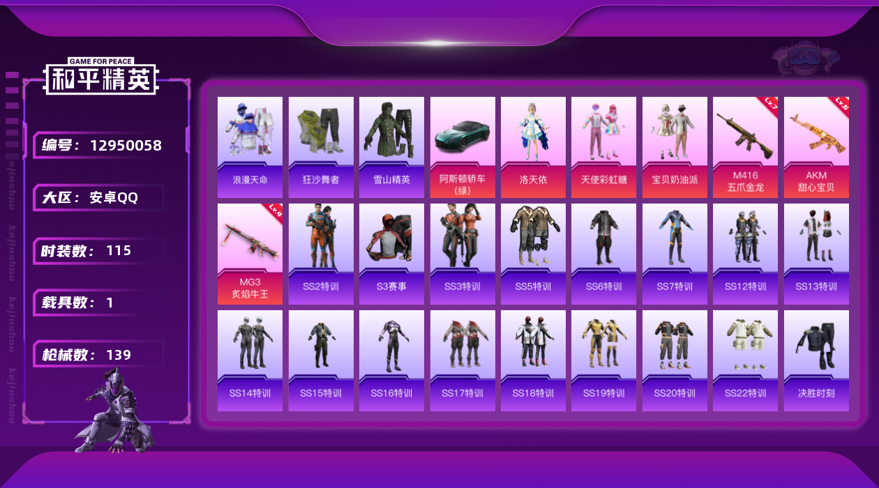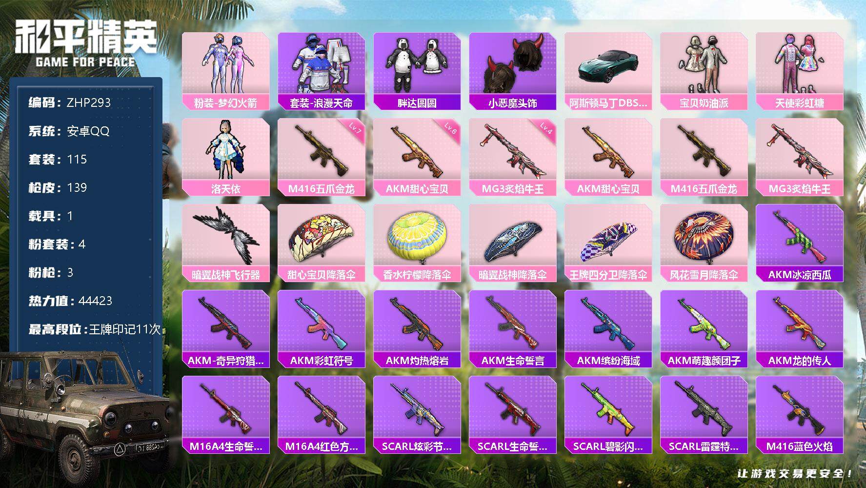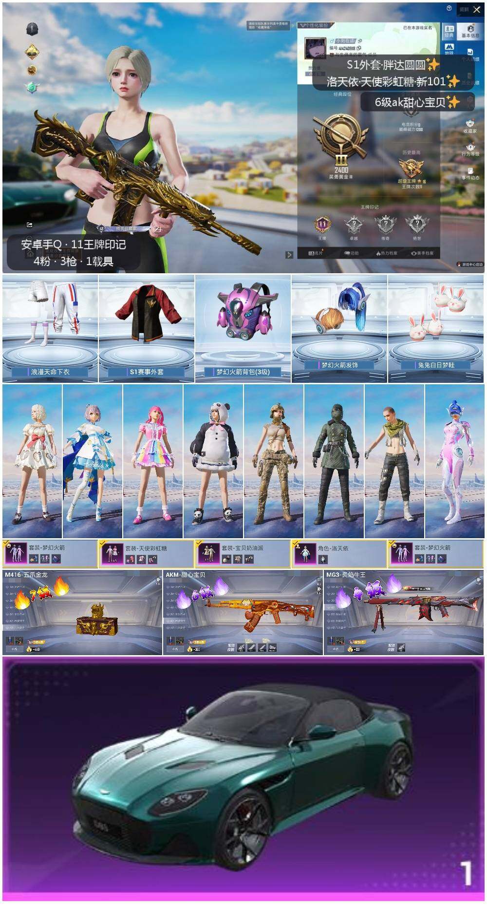 [12950058]安卓 手Q-4粉装-3特效枪-1载具-1粉色飞行器-4.4w热力值-11王牌印记-115套装-139枪皮【热门品类】:粉装-梦幻火箭,套装-浪漫天命,套装-胖达圆圆,小恶魔头饰【粉色载具】:阿斯顿马丁DBS(绿)【粉色套装】:粉装-宝贝奶油派,粉装-天使彩虹糖,粉装-梦幻火箭,角色-洛天依【粉色枪皮等级】:AKM-甜心宝贝(六级),M416-五爪金龙(七级),MG3-炙焰牛王(四级)【粉色飞行器】:暗翼战神飞行器