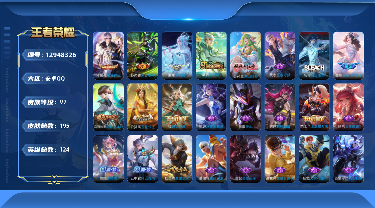 - [11657222]V8 1典藏 4无双 7珍品传说 40传说 105英雄 174皮肤 可修改实名 优质装备:银白咏叹调(倪克斯侍卫),韩信群星魔术团(韩信无双),花合斗,离恨烟(公孙离无双),器灵·螭龙剑,江户川柯南,怪盗基德,器灵·落星盏,酷洛米之心,大耳狗之梦,云鹰飞将(小将军),绛天战甲(鸡嘴战神),黄金白羊座,久胜战神,一念神魔,云霓雀翎,零号·赤焰,海洋之心,音你心动-周瑜,挚爱之约,无双飞将,山海·炽霜斩(李信年限),燃星之曲,浮生妄,妄想实况,妄想奇谈,澜逐花归海,黄金天蝎座,玄雷天君,涂山容容 珍品传说:时之奇旅-孙策,兔狲·蓬尾 传说皮:吕布曦玄引,云诺千山,铠冥王哈迪斯,续相思,星之鸣奏,祥瑞亨通,幻光神枪 珍宝阁皮:万物之道 限定皮:愿照·九州拓(澜年限),愿照·福禄聚(蔡文姬年限),愿照·岁时盈(虞姬年限),愿照·山河定(司空震年限),愿照·众生和(妲己年限),愿照·千秋盛(女娲年限),逐霄战戟,映山客,陌上桑,鸣野蒿,夏侯惇霜北刀,时雨天司(水龙头),诗剑行,怒海麟威,御风骁将(吕布年限),引擎之心,启示之音,冰霜神祇 史诗皮:鸭鸭历险记-刘禅,苍鳞隐世,器灵·浮梦炉,糖绘人间,狼魂孤将,绮世丹青,瑰影绮梦,化蝶舞,谪仙醉月,龙之律动,藏狐·褐绒,布丁狗之誓,茶境仙,怒海争锋,炽弈燎原,破空之剑,战舞者,东方月初,蒙犽顽岩魄,埋骨钱,海诺心动手记,百相守梦-百里守约,星界特工,百相守梦-黄忠,特工魅影,冰冠公主,青蛇,偶像歌手,暗夜猫娘,女仆咖啡,水果甜心,星夜王子,功夫厨神,鬼剑武藏,天秀·启明,地狱岩魂,缤纷独角兽,乘风破浪,逐浪之夏,月团寄思,水晶猎龙者,曙光守护者,金属风暴,圣诞恋歌,鹰眼统帅,魅力维加斯,赏金猎手,未来纪元-赵云