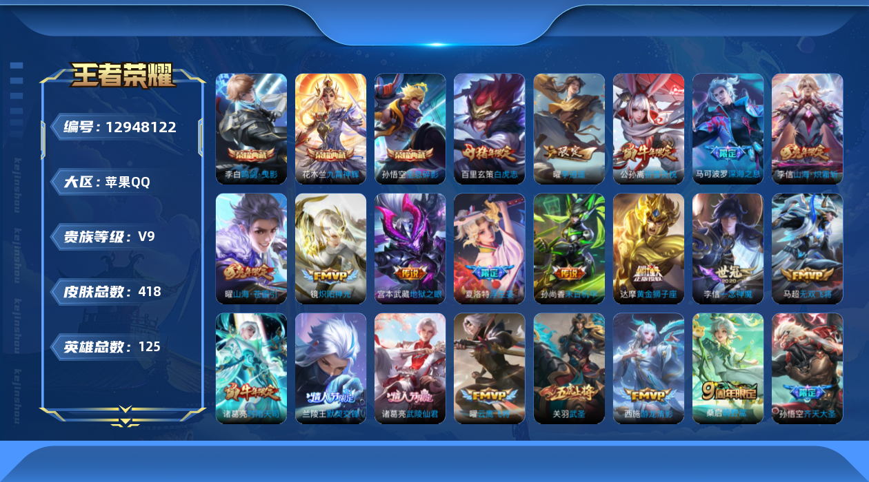[12948122]【暑期末清货/特价急出/永久包赔】:苹果Q-V9-最强王者段位-125英雄-418皮肤-3典藏-38传说-137史诗
