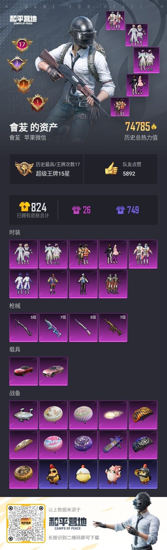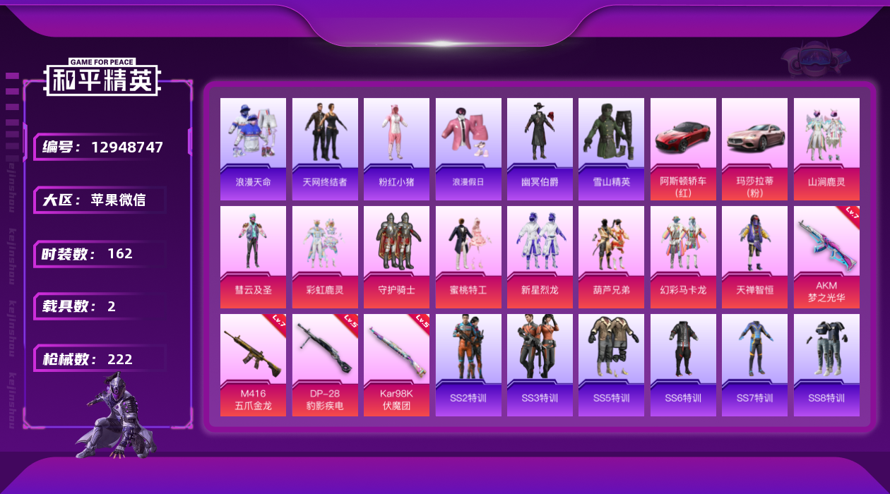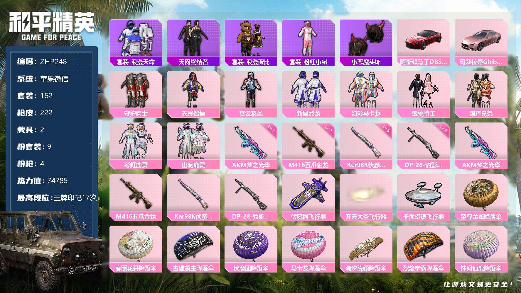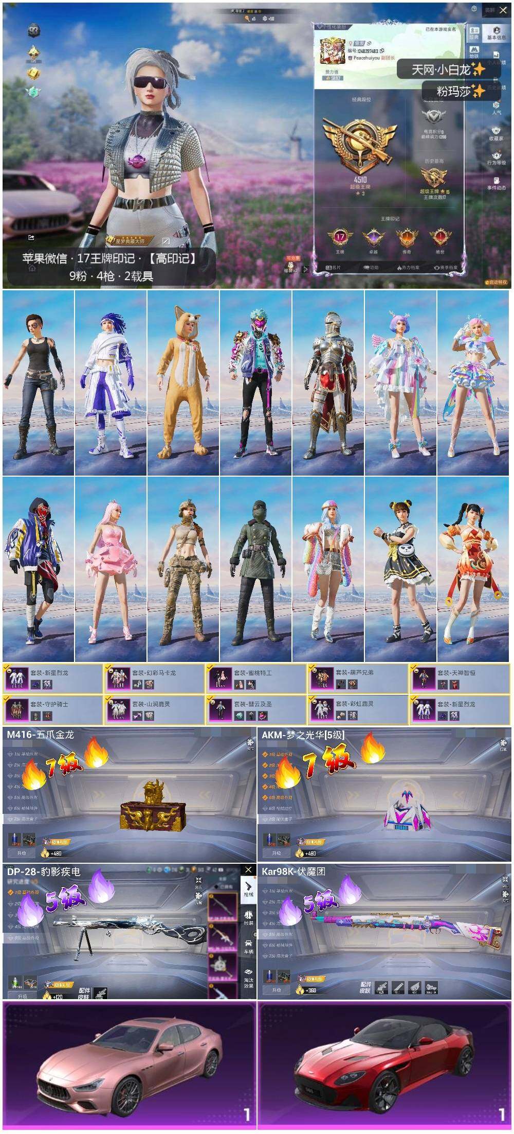 [12948747]素材身法号/绝世印记1 苹果 微信-9粉装-4特效枪-2载具-3粉色飞行器-7.4w热力值-17王牌印记-162套装-222枪皮【热门品类】:套装-浪漫天命,套装-天网终结者,套装-浪漫波比,套装-粉红小猪,小恶魔头饰【粉色载具】:阿斯顿马丁DBS(红),玛莎拉蒂Ghibli(粉)【粉色套装】:粉装-守护骑士,粉装-天禅智恒,粉装-彗云及圣,粉装-新星烈龙,粉装-幻彩马卡龙,粉装-蜜桃特工,粉装-葫芦兄弟,粉装-彩虹鹿灵,粉装-山涧鹿灵【粉色枪皮等级】:AKM-梦之光华(七级),M416-五爪金龙(七级),Kar98K-伏魔团(五级),DP-28-豹影疾电(五级)【粉色飞行器】:伏魔团飞行器,齐天大圣飞行器,千面幻镜飞行器