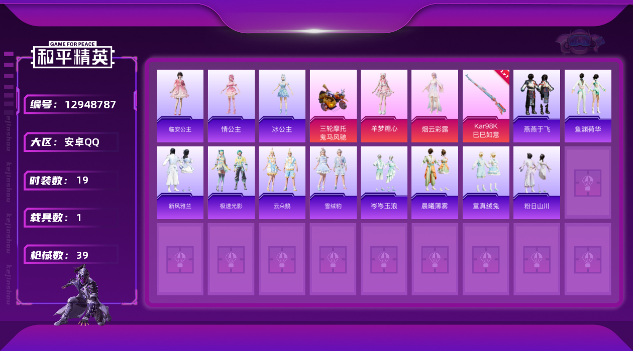 [12948787]【特价急出/详情看图】:安卓 手Q-2粉装-1特效枪-1载具-1.3w热力值-19套装-39枪皮【粉色载具】:鬼马风驰【粉色套装】:角色-烟云彩露,角色-羊梦糖心【粉色枪皮等级】:Kar98K-巳巳如意(一级)