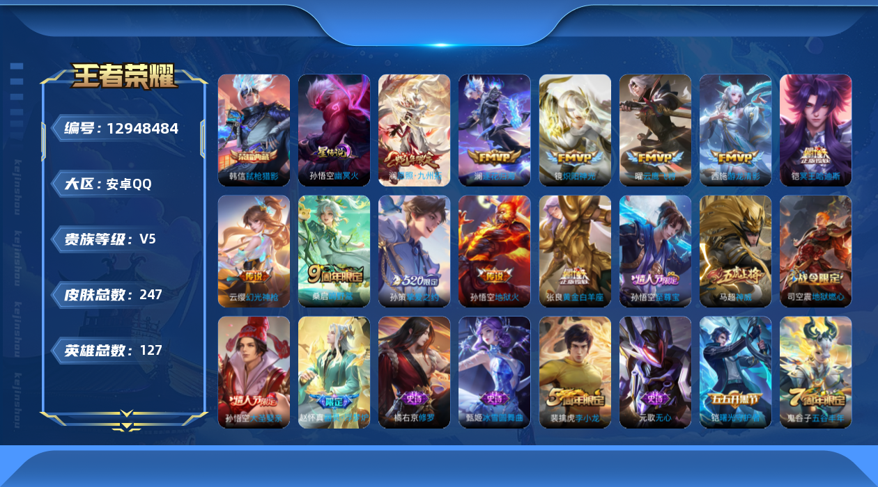 [12948484]【特价急出/详情看图】安卓Q-V5-至尊星耀III段位-127英雄-247皮肤-1典藏-11传说-2星元-59史诗