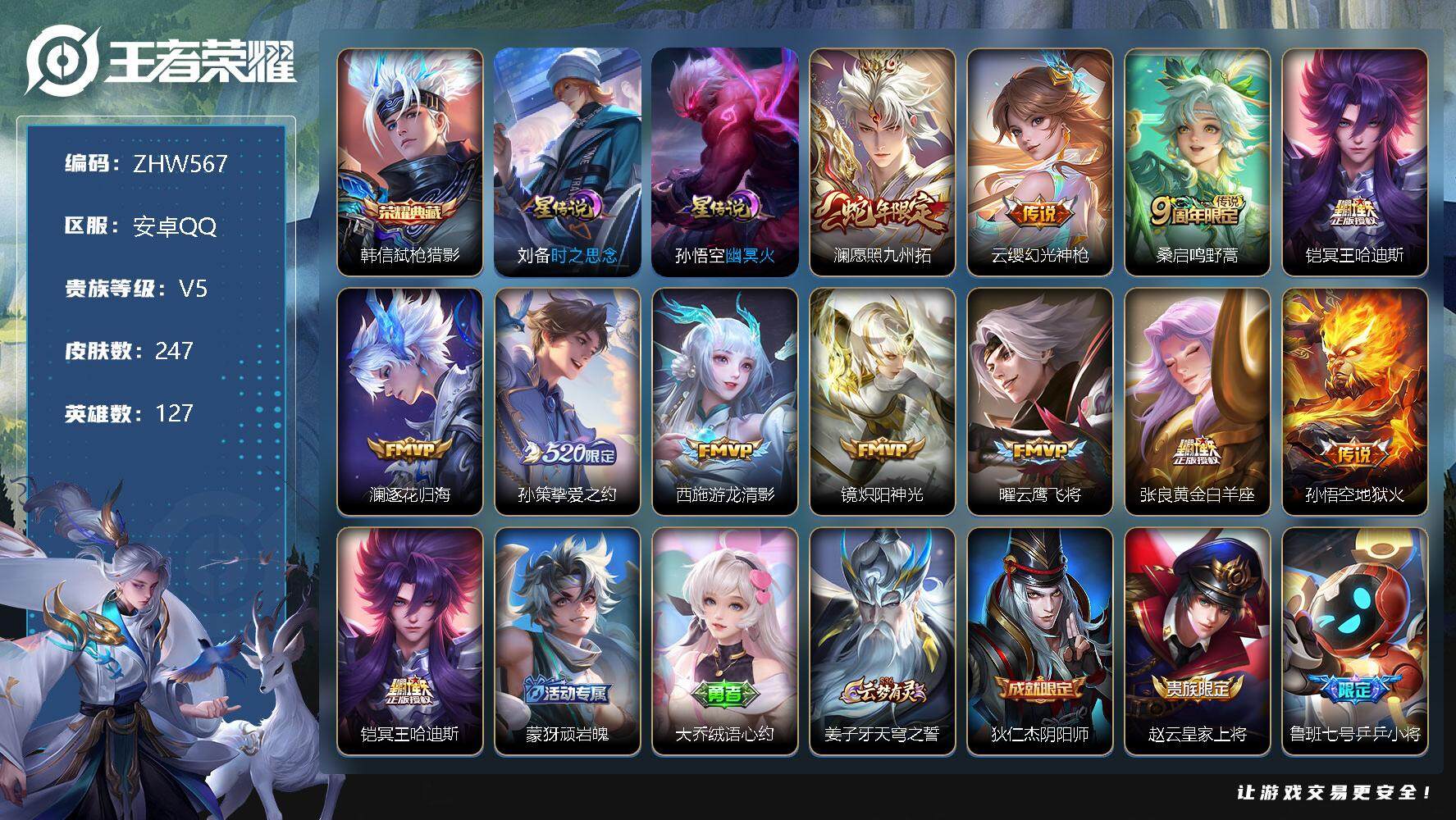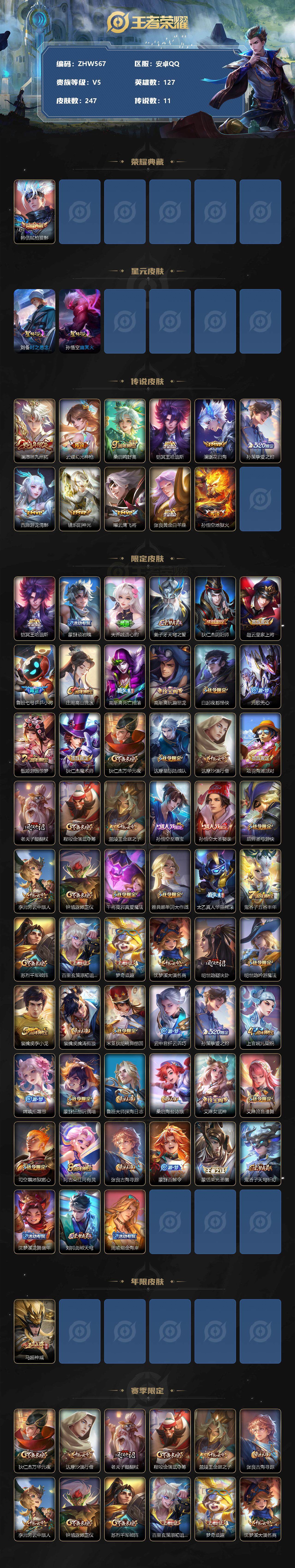 [12948484]【特价急出/详情看图】安卓Q-V5-至尊星耀III段位-127英雄-247皮肤-1典藏-11传说-2星元-59史诗 【荣耀典藏】:韩信弑枪猎影 【传说皮肤】:澜愿照九州拓,云缨幻光神枪,桑启鸣野蒿,铠冥王哈迪斯,澜逐花归海,孙策挚爱之约,西施游龙清影,镜炽阳神光,曜云鹰飞将,张良黄金白羊座,孙悟空地狱火 【限定皮肤】:铠冥王哈迪斯,蒙犽顽岩魄,大乔绒语心约,姜子牙天穹之誓,狄仁杰阴阳师,赵云皇家上将,鲁班七号乒乒小将,庄周高山流水,高渐离死亡摇滚,高渐离玩趣恶龙,白起夜都怪侠,元歌无心,甄姬游园惊梦,狄仁杰魔术师,狄仁杰万华元夜,达摩星际陆战队,达摩沙漠行僧,项羽海滩派对,老夫子醍醐杖,程咬金演武夺筹,兰陵王金庭之子,孙悟空至尊宝,孙悟空大圣娶亲,后羿圣弓游侠,李元芳云中旅人,钟馗驱傩正仪,干将莫邪真爱魔法,雅典娜单词大作战,太乙真人华丽摇滚,鬼谷子五谷丰年,苏烈千军破阵,百里玄策原初追逐者,梦奇顽趣,沈梦溪大漠名商,明世隐疑决卦,明世隐吟游魔法,裴擒虎李小龙,裴擒虎擒涛扼浪,米莱狄胡桃异想国,云中君纤云弄巧,孙策挚爱之约,上官婉儿梁祝,嫦娥拒霜思,蒙犽狂想玩偶喵,鲁班大师探海日志,桑启海盐诗旅,艾琳女武神,艾琳流音漫舞,司空震地狱燃心,阿古朵江河有灵,张良古海寻踪,蒙犽百解令,蒙恬荣光圣徽,鬼谷子天穹祈灯,沈梦溪龙舞盛年,刘邦剑破天穹,周瑜熔金海岸 【年限皮肤】:马超神威 【赛季限定】:狄仁杰万华元夜,达摩沙漠行僧,老夫子醍醐杖,程咬金演武夺筹,兰陵王金庭之子,张良古海寻踪,李元芳云中旅人,钟馗驱傩正仪,苏烈千军破阵,百里玄策原初追逐者,梦奇顽趣,沈梦溪大漠名商,明世隐疑决卦,裴擒虎擒涛扼浪,鲁班大师探海日志,桑启海盐诗旅,鬼谷子天穹祈灯,蒙恬荣光圣徽,刘邦剑破天穹,姜子牙天穹之誓 【战令限定】:白起夜都怪侠,达摩星际陆战队,艾琳流音漫舞,后羿圣弓游侠,干将莫邪真爱魔法,雅典娜单词大作战,明世隐吟游魔法,米莱狄胡桃异想国,蒙犽狂想玩偶喵,司空震地狱燃心 【史诗皮肤】:赵云皇家上将,赵云未来纪元,貂蝉圣诞恋歌,甄姬冰雪圆舞曲,狄仁杰魔术师,廉颇地狱岩魂,宫本武藏鬼剑武藏,孙尚香水果甜心,嬴政摇滚巨星,妲己魅力维加斯,妲己女仆咖啡,墨子金属风暴,曹操幽灵船长,李白千年之狐,吕布末日机甲,张飞乱世虎臣,孙悟空至尊宝,花木兰水晶猎龙者,刘邦德古拉伯爵,兰陵王暗隐猎兽者,