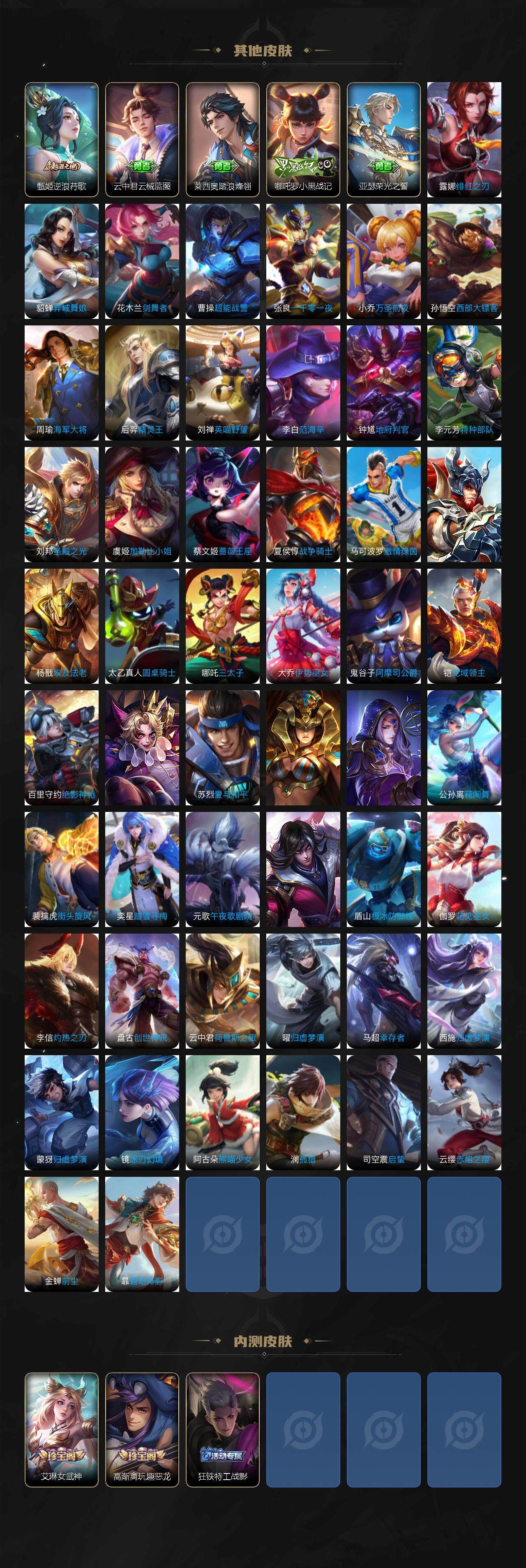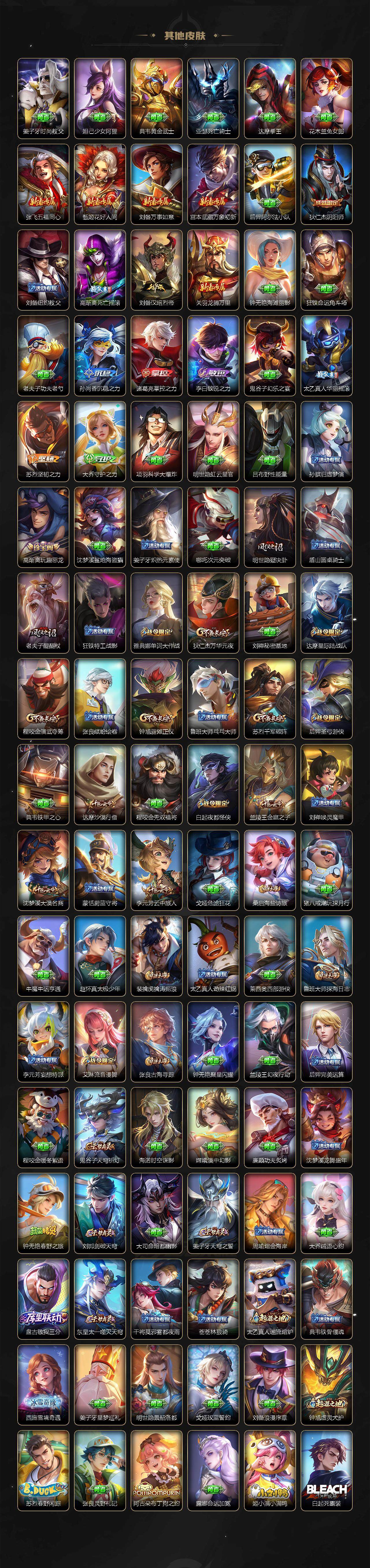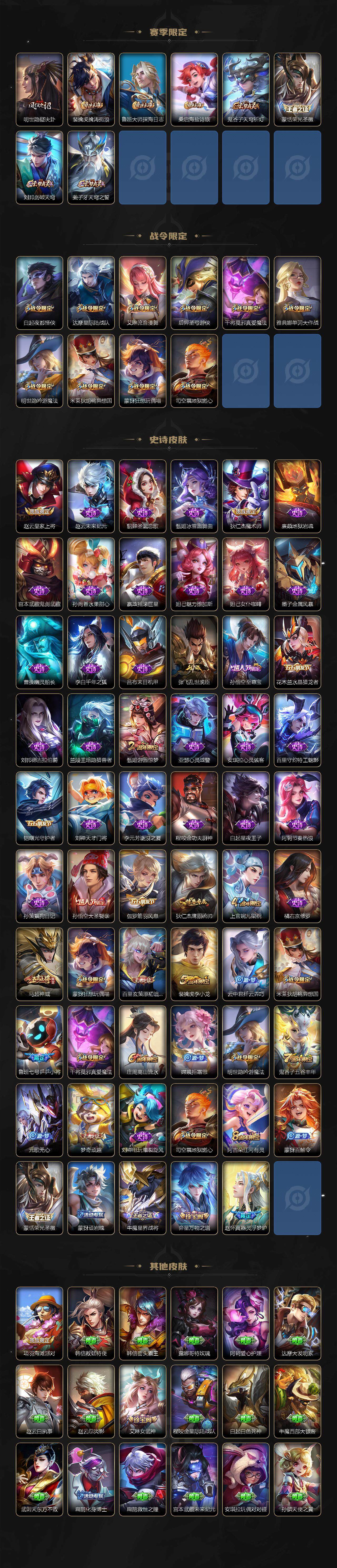【限定皮肤】:铠冥王哈迪斯,蒙犽顽岩魄,大乔绒语心约,姜子牙天穹之誓,狄仁杰阴阳师,赵云皇家上将,鲁班七号乒乒小将,庄周高山流水,高渐离死亡摇滚,高渐离玩趣恶龙,白起夜都怪侠,元歌无心,甄姬游园惊梦,狄仁杰魔术师,狄仁杰万华元夜,达摩星际陆战队,达摩沙漠行僧,项羽海滩派对,老夫子醍醐杖,程咬金演武夺筹,兰陵王金庭之子,孙悟空至尊宝,孙悟空大圣娶亲,后羿圣弓游侠,李元芳云中旅人,钟馗驱傩正仪,干将莫邪真爱魔法,雅典娜单词大作战,太乙真人华丽摇滚,鬼谷子五谷丰年,苏烈千军破阵,百里玄策原初追逐者,梦奇顽趣,沈梦溪大漠名商,明世隐疑决卦,明世隐吟游魔法,裴擒虎李小龙,裴擒虎擒涛扼浪,米莱狄胡桃异想国,云中君纤云弄巧,孙策挚爱之约,上官婉儿梁祝,嫦娥拒霜思,蒙犽狂想玩偶喵,鲁班大师探海日志,桑启海盐诗旅,艾琳女武神,艾琳流音漫舞,司空震地狱燃心,阿古朵江河有灵,张良古海寻踪,蒙犽百解令,蒙恬荣光圣徽,鬼谷子天穹祈灯,沈梦溪龙舞盛年,刘邦剑破天穹,周瑜熔金海岸