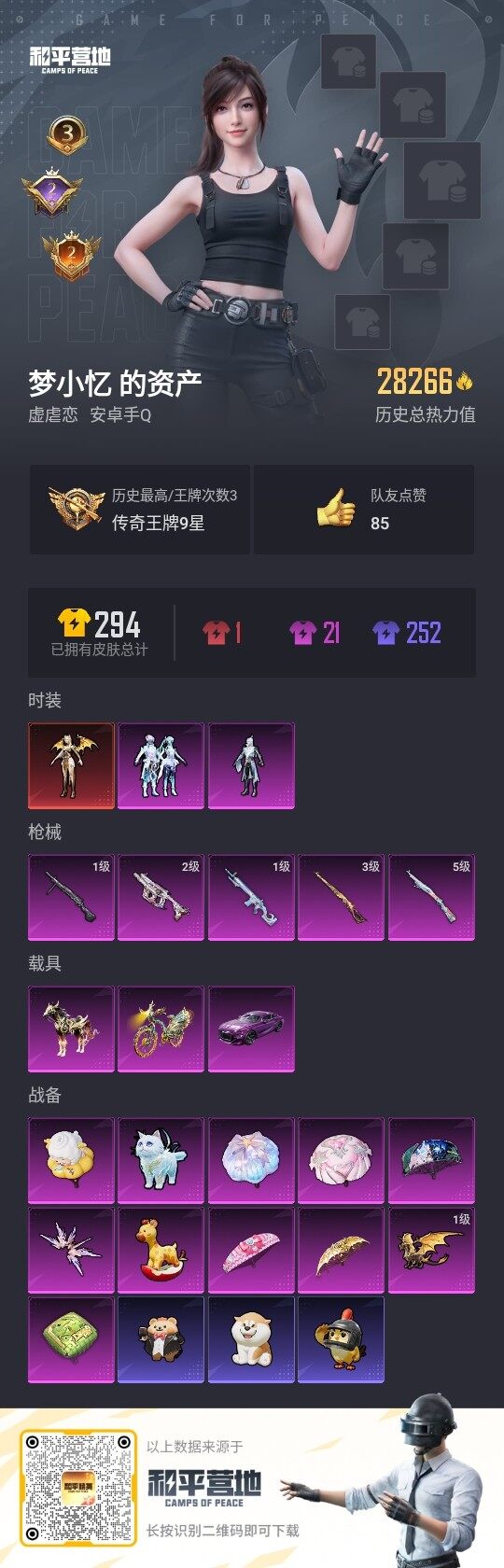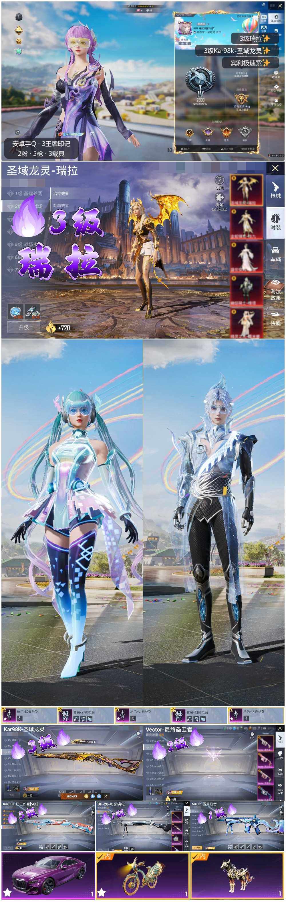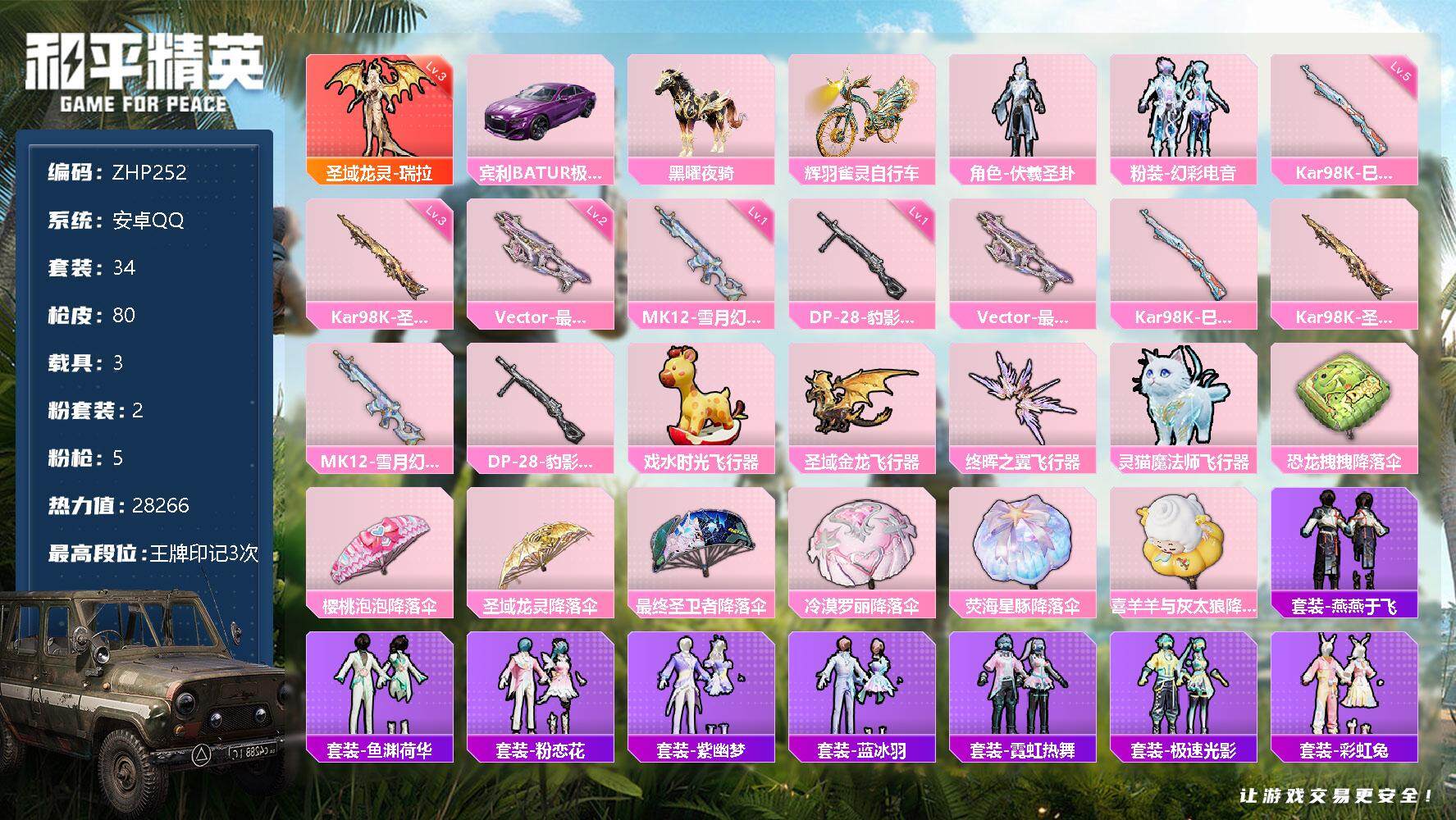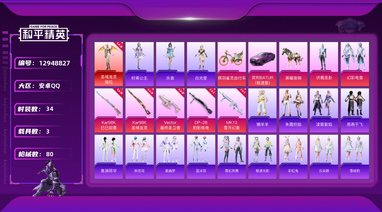 [12948827]素材身法号/扭蛋碎片732/璀璨碎片734 安卓 手Q-1神装-2粉装-5特效枪-3载具-4粉色飞行器-2.8w热力值-3王牌印记-34套装-80枪皮【红色神装等级】:圣域龙灵-瑞拉(三级)【粉色载具】:宾利BATUR(极速紫),黑曜夜骑,辉羽雀灵自行车【粉色套装】:角色-伏羲圣卦,粉装-幻彩电音【粉色枪皮等级】:Vector-最终圣卫者(二级),Kar98K-巳巳如意(五级),Kar98K-圣域龙灵(三级),MK12-雪月幻音(一级),DP-28-豹影疾电(一级)【粉色飞行器】:戏水时光飞行器,圣域金龙飞行器,终晖之翼飞行器,灵猫魔法师飞行器
