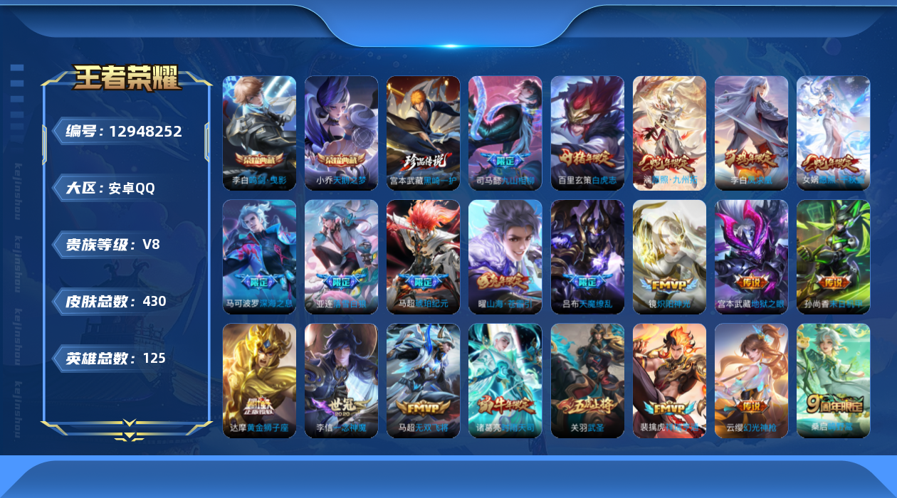- [12948018]【特价急出/详情看图】:安卓Q-V0-尊贵铂金II段位-120英雄-174皮肤-3传说-39史诗 【英雄全皮】:影全皮 【传说皮肤】:貂蝉猫影幻舞,干将莫邪久胜战神,孙悟空地狱火 【限定皮肤】:白起狰,姜子牙天穹之誓,狄仁杰阴阳师,虞姬凯尔特女王,赵云皇家上将,孙尚香蔷薇恋人,鲁班七号狮舞东方,庄周高山流水,高渐离死亡摇滚,孙膑妖精王,扁鹊炼金王,芈月重明,周瑜赤莲之焰,夏侯惇朔风刀,甄姬游园惊梦,曹操烛龙,典韦穷奇,狄仁杰魔术师,狄仁杰万华元夜,达摩沙漠行僧,项羽海滩派对,老夫子醍醐杖,程咬金演武夺筹,兰陵王驯魔猎人,兰陵王金庭之子,牛魔御旌,李元芳云中旅人,钟馗神迹守卫,钟馗驱傩正仪,杨玉环遇见飞天,雅典娜单词大作战,雅典娜黎明之约,蔡文姬繁星吟游,太乙真人饕餮,鬼谷子原初探秘者,苏烈千军破阵,百里玄策原初追逐者,弈星混沌棋,明世隐疑决卦,裴擒虎李小龙,狂铁御狮,米莱狄御霄,云中君纤云弄巧,盾山御銮,猪八戒猪悟能,上官婉儿梁祝,嫦娥拒霜思,蒙犽狂想玩偶喵,桑启海盐诗旅,张良古海寻踪,周瑜熔金海岸 【赛季限定】:孙膑妖精王,扁鹊炼金王,白起狰,芈月重明,夏侯惇朔风刀,曹操烛龙,典韦穷奇,狄仁杰万华元夜,达摩沙漠行僧,老夫子醍醐杖,程咬金演武夺筹,兰陵王金庭之子,张良古海寻踪,牛魔御旌,李元芳云中旅人,虞姬凯尔特女王,钟馗驱傩正仪,雅典娜黎明之约,太乙真人饕餮,鬼谷子原初探秘者,苏烈千军破阵,百里玄策原初追逐者,弈星混沌棋,明世隐疑决卦,狂铁御狮,米莱狄御霄,盾山御銮,桑启海盐诗旅,姜子牙天穹之誓 【战令限定】:鲁班七号狮舞东方,周瑜赤莲之焰,兰陵王驯魔猎人,钟馗神迹守卫,雅典娜单词大作战,蒙犽狂想玩偶喵 【史诗皮肤】:露娜紫霞仙子,赵云皇家上将,貂蝉圣诞恋歌,甄姬冰雪圆舞曲,狄仁杰魔术师,廉颇地狱岩魂,宫本武藏鬼剑武藏,孙尚香蔷薇恋人,孙尚香水果甜心,嬴政摇滚巨星,妲己魅力维加斯,妲己女仆咖啡,墨子金属风暴,吕布圣诞狂欢,张飞乱世虎臣,小乔缤纷独角兽,诸葛亮黄金分割率,甄姬游园惊梦,安琪拉心灵骇客,百里守约特工魅影,李元芳逐浪之夏,白起星夜王子,杨玉环遇见飞天,孙策猫狗日记,鲁班七号狮舞东方,狄仁杰鹰眼统帅,兰陵王驯魔猎人,上官婉儿梁祝,蔡文姬繁星吟游,娜可露露晚萤,不知火舞魅语,蒙犽狂想玩偶喵,百里玄策原初追逐者,裴擒虎李小龙,云中君纤云弄巧,猪八戒猪悟能,庄