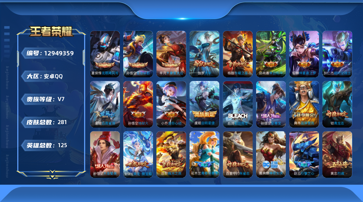 - [12855790]安卓Q-V4-最强王者段位-124英雄-293皮肤-4典藏-0珍品无双-0无双-0珍品传说-23传说-85史诗 【荣耀典藏】:小乔天鹅之梦,鲁班七号星空梦想,芈月大秦宣太后,铠银白咏叹调 【内测皮肤】:嬴政优雅恋人,艾琳女武神,高渐离玩趣恶龙,狂铁特工战影 【传说皮肤】:狄仁杰超时空战士,吕布天魔缭乱,孙尚香末日机甲,李白凤求凰,貂蝉仲夏夜之梦,诸葛亮武陵仙君,张良黄金白羊座,貂蝉猫影幻舞,伽罗太华,李信一念神魔,曜云鹰飞将,虞姬启明星使,镜炽阳神光,公孙离祈雪灵祝,李元芳飞鸢探春,曜李逍遥 ,西施游龙清影,马可波罗深海之息,娜可露露前尘镜,不知火舞绯月行,伽罗炽翼辉光,夏侯惇霜北刀,桑启鸣野蒿 【限定皮肤】:夏侯惇霜北刀,姜子牙天穹之誓,狄仁杰阴阳师,赵云皇家上将,妲己时之彼端,嬴政优雅恋人,高渐离玩趣恶龙,孙膑天狼运算者,吕布天魔缭乱,吕布猎兽之王,周瑜赤莲之焰,元歌云间偶戏,元歌无心,夏侯惇朔风刀,曹操天狼征服者,马可波罗逐梦之星,马可波罗暗影游猎,马可波罗深海之息,狄仁杰魔术师,狄仁杰万华元夜,达摩星际陆战队,达摩沙漠行僧,项羽海滩派对,老夫子醍醐杖,安琪拉魔法小厨娘,程咬金演武夺筹,王昭君凤凰于飞,王昭君午后时光,兰陵王驯魔猎人,兰陵王金庭之子,花木兰青春决赛季,不知火舞绯月行,娜可露露前尘镜,亚瑟潮玩骑士王,牛魔御旌,后羿圣弓游侠,李元芳银河之约,李元芳云中旅人,虞姬启明星使,钟馗驱傩正仪,干将莫邪真爱魔法,雅典娜单词大作战,雅典娜黎明之约,蔡文姬繁星吟游,鬼谷子原初探秘者,鬼谷子五谷丰年,诸葛亮武陵仙君,苏烈千军破阵,百里玄策原初追逐者,百里守约朱雀志,弈星混沌棋,梦奇顽趣,公孙离蜜橘之夏,公孙离祈雪灵祝,公孙离玉兔公主,沈梦溪星空之诺,沈梦溪大漠名商,明世隐疑决卦,裴擒虎李小龙,裴擒虎擒涛扼浪,狂铁电玩高手,米莱狄胡桃异想国,瑶山海碧波行,云中君纤云弄巧,伽罗太华,伽罗天狼溯光者,伽罗炽翼辉光,盾山御銮,猪八戒西部大镖客,上官婉儿梁祝,上官婉儿天狼绘梦者,嫦娥如梦令,嫦娥拒霜思,嫦娥暖冬兔眠,曜李逍遥 ,蒙犽狂想玩偶喵,鲁班大师匿光启智者,鲁班大师探海日志,桑启海盐诗旅,暃星界游侠,艾琳女武神,阿古朵江河有灵,张良古海寻踪,蒙恬荣光圣徽,高渐离燃音魔法,妲己灵卜魔法,鬼谷子天穹祈灯,沈梦溪龙舞盛年 【年限皮肤】:百里守约朱雀志,王昭君凤凰于飞,李白