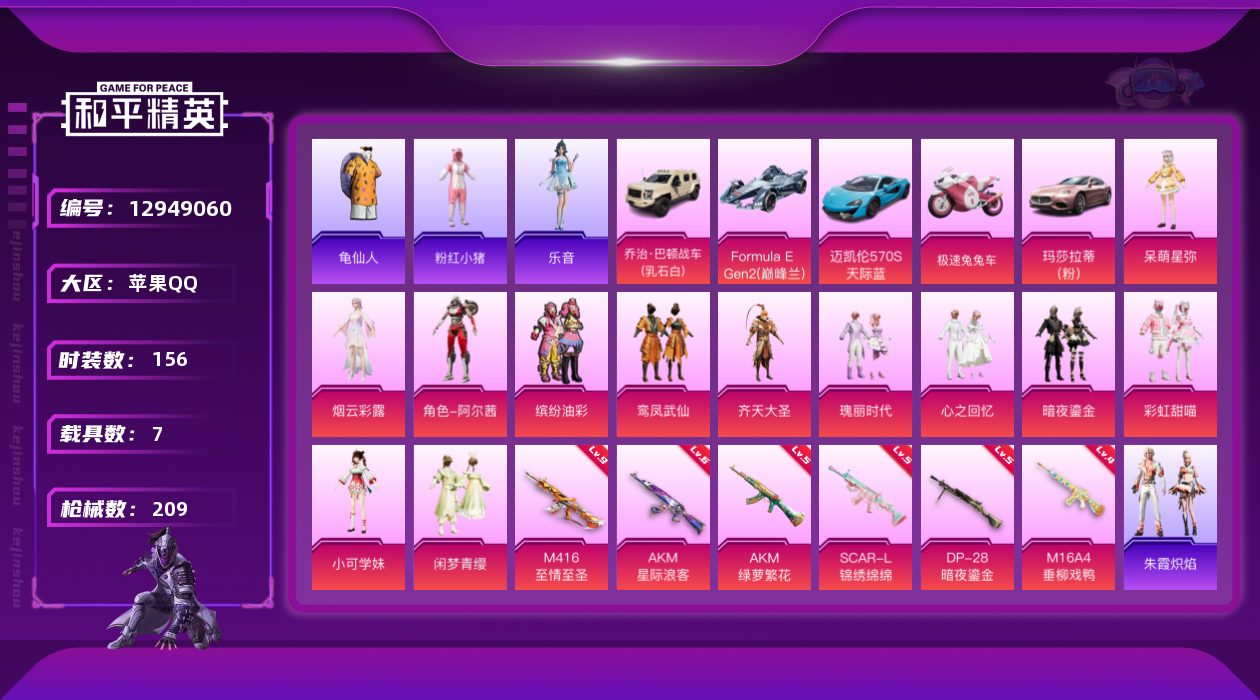 [12949060]M416-至情至圣(九级)/地铁满天赋【特价急出/详情看图】:苹果 手Q-12粉装-6特效枪-7载具-5粉色飞行器-7.6w热力值-14王牌印记-156套装-209枪皮【热门品类】:粉装-缤纷油彩,套装-龟仙人,套装-粉红小猪【粉色载具】:玛莎拉蒂Ghibli(粉),乔治巴顿战车(乳石白),迈凯伦570S(天际蓝),Formula E Gen2(巅峰兰),极速兔兔车,僚机-萌兔起飞,快艇-自由的鲸【粉色套装】:粉装-缤纷油彩,粉装-齐天大圣,粉装-鸾凤武仙,粉装-彩虹甜喵,粉装-暗夜鎏金,粉装-心之回忆,粉装-瑰丽时代,角色-呆萌星弥,角色-小可学妹,角色-阿尔茜,粉装-闲梦青缨,角色-烟云彩露【粉色枪皮等级】:AKM-星际浪客(六级),AKM-绿萝繁花(五级),M16A4-垂柳戏鸭(四级),SCAR-L-锦绣绵绵(五级),M416-至情至圣(九级),DP-28-暗夜鎏金(五级)【粉色飞行器】:齐天大圣飞行器,梦幻舞会飞行器,变形金刚飞行器,沙丘之主天马,冠军兔兔飞行器