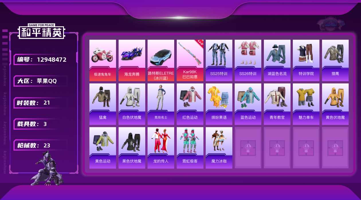 [12948472]【特价急出/详情看图】:苹果 手Q-1特效枪-3载具-1粉色飞行器-9383热力值-2王牌印记-21套装-23枪皮【粉色载具】:路特斯ELETRE(冰川蓝),海龙奔腾,极速兔兔车【粉色枪皮等级】:Kar98K-巳巳如意(二级)【粉色飞行器】:天之羽翼飞行器