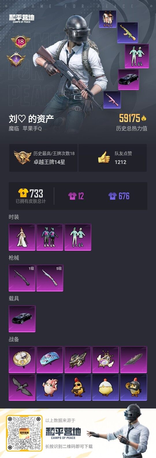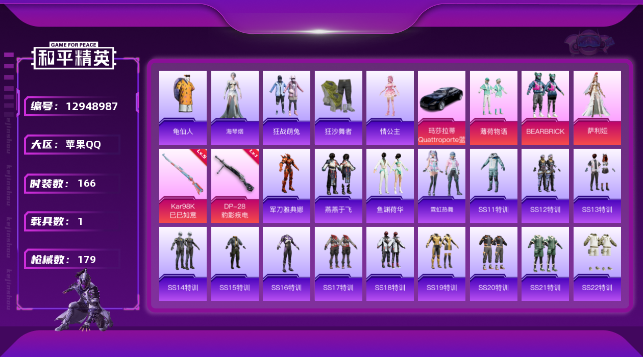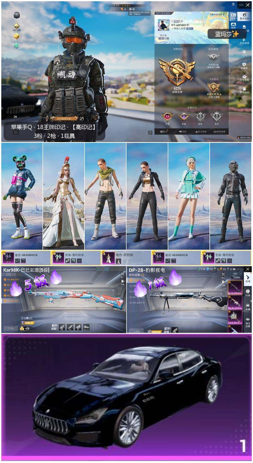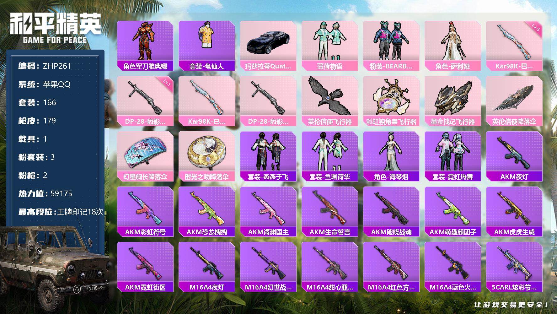 [12948987]苹果 手Q-3粉装-2特效枪-1载具-3粉色飞行器-5.9w热力值-18王牌印记-166套装-179枪皮【热门品类】:角色-军刀雅典娜,套装-龟仙人【粉色载具】:玛莎拉蒂Quattroporte(夜幕蓝)【粉色套装】:粉装-薄荷物语,粉装-BEARBRICK,角色-萨利娅【粉色枪皮等级】:Kar98K-巳巳如意(五级),DP-28-豹影疾电(一级)【粉色飞行器】:英伦信使飞行器,彩虹独角兽飞行器,墨金战记飞行器