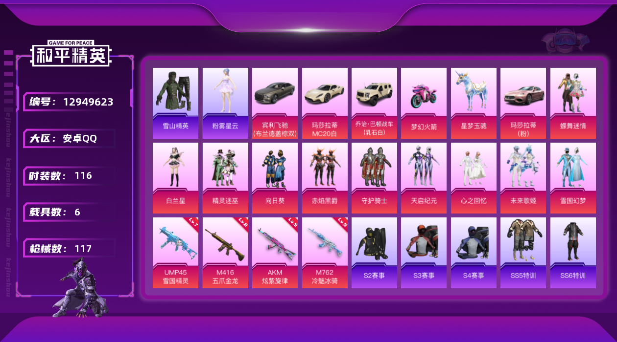 [12949623]s1全套/雪国/素材身法号【特价急出/详情看图】:安卓 手Q-10粉装-4特效枪-6载具-5粉色飞行器-5.5w热力值-4王牌印记-116套装-117枪皮【热门品类】:粉装-雪国幻梦,套装-S1赛事【粉色载具】:玛莎拉蒂MC20(星石白),玛莎拉蒂Ghibli(粉),乔治巴顿战车(乳石白),宾利飞驰(布罗德盖棕双色),双人摩托-梦幻火箭,星梦玉骢【粉色套装】:粉装-守护骑士,粉装-雪国幻梦,粉装-蝶舞迷情,粉装-精灵迷巫,粉装-天启纪元,粉装-向日葵,粉装-赤焰黑爵,粉装-心之回忆,粉装-未来歌姬,角色-白兰星【粉色枪皮等级】:AKM-炫紫旋律(五级),M416-五爪金龙(六级),M762-冷魅冰骑(五级),UMP45-雪国精灵(七级)【粉色飞行器】:春暖花开飞行器,精灵迷巫飞行器,梦幻火箭飞行器