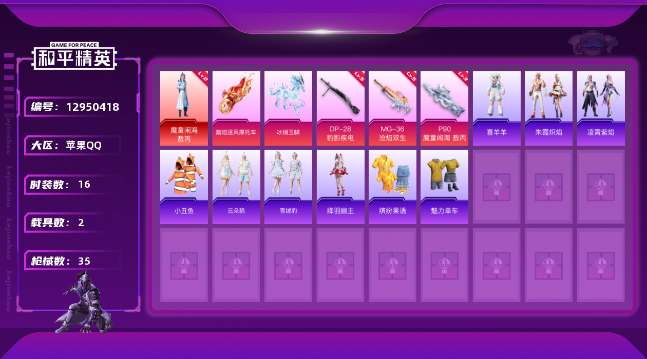 [12950418]【特价急出/详情看图】:苹果 手Q-1神装-3特效枪-2载具-2粉色飞行器-1.3w热力值-2王牌印记-16套装-35枪皮【红色神装等级】:魔童闹海-敖丙(二级)【热门品类】:套装-小丑鱼【粉色载具】:踏焰逐风摩托车,冰绡玉鳞【粉色枪皮等级】:P90-魔童闹海 敖丙(三级),DP-28-豹影疾电(五级),MG-36-沧焰双生(五级)【粉色枪皮】:P90-魔童闹海 敖丙,DP-28-豹影疾电,MG-36-沧焰双生【粉色飞行器】:灵珠游龙飞行器