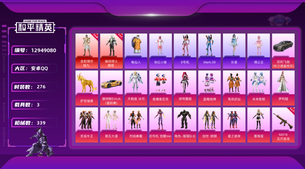 - PX_2085658- 安卓手Q-12王牌印记-有战神框-12粉装-8特效枪-1载具-91971热力值-212套装-276枪皮-4卓越印记-3传奇印记 【12粉装】,宝贝奶油派,缤纷油彩,洛天依,智耀战神,木曜青龙,复仇流浪者,猩猩队长,星云暗核,宙之时溯,天禅智恒,未来歌姬,瑰丽时代 【8特效枪】AKM-星际浪客-5级 SCAR-L-万古烈焰-6级 M416-风花雪月-7级 Kar98K-巳巳如