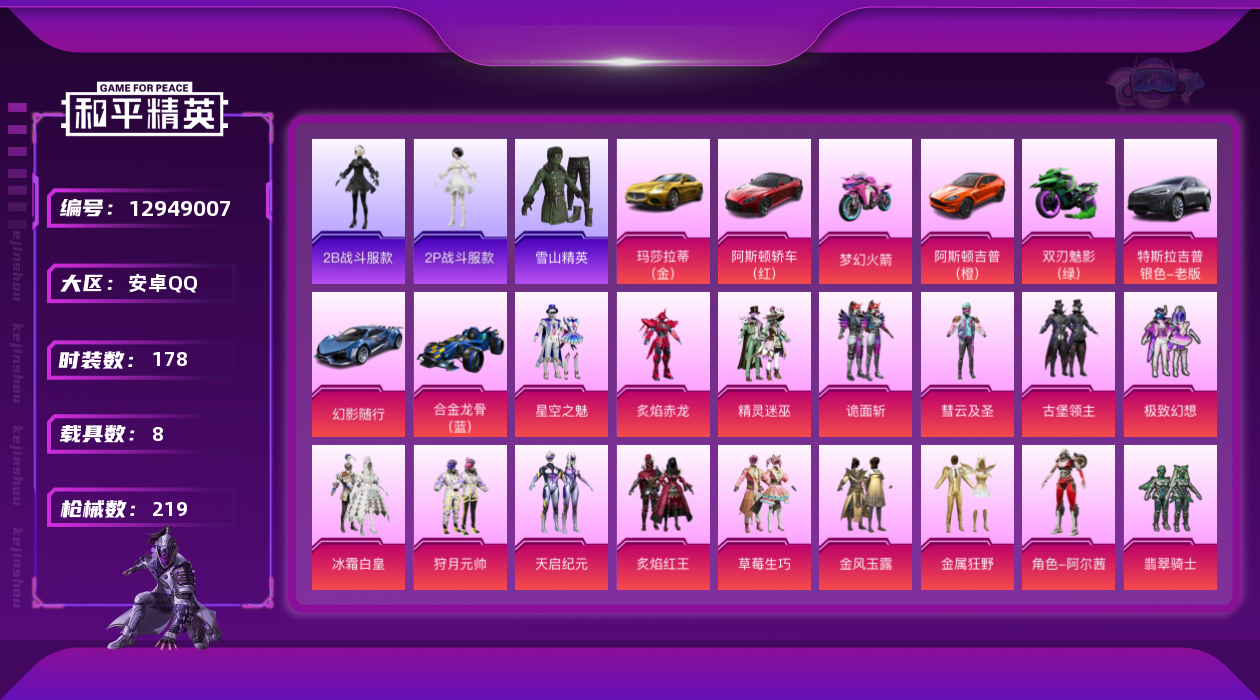 [12949007]素材身法号/连体王者v8 【特价急出/详情看图】:安卓 手Q-23粉装-16特效枪-8载具-6粉色飞行器-9.6w热力值-9王牌印记-178套装-219枪皮【热门品类】:粉装-梦幻火箭,套装-奇异狩猎者,套装-忍者信条,角色-2B战斗服款,角色-2P战斗服款,套装-浪漫波比,熔岩游骑兵面罩【粉色载具】:特斯拉Model X(冷光银),阿斯顿马丁DBS(红),阿斯顿马丁DBX(橙),玛莎拉蒂Ghibli(金),幻影随行,合金龙骨(蓝),双人摩托-梦幻火箭,双人摩托-双刃魅影(绿)【粉色套装】:粉装-精灵迷巫,粉装-梦幻火箭,粉装-天启纪元,粉装-金风玉露,粉装-金属狂野,粉装-古堡领主,粉装-天禅智恒,粉装-彗云及圣,粉装-狩月元帅,粉装-新星烈龙,粉装-极致幻想,粉装-星空之魅,粉装-诡面斩,粉装-草莓生巧,粉装-苍蓝魅影,粉装-翡翠骑士,粉装-冰霜白皇,粉装-炙焰红王,粉装-香水柠檬,粉装-王牌四分卫,粉装-炙焰赤龙,粉装-飓风飞鹰,角色-阿尔茜【粉色枪皮等级】:AKM-炫紫旋律(四级),SCAR-L-梦幻火箭(四级),M416-心之恋语(七级),GROZA-香水柠檬(四级),AUG-超新星(四级),M762-甜蜜誓约(一级),M762-激战未来(四级),P90-能量风暴(四级),Kar98K-伏魔团(四级),Kar98K-巳巳如意(三级),M24-星之信仰(五级),M24-莲影清波(二级),AWM-花间之火(四级),SKS-诡面斩(一级),Mini14-荧光虫舞(一级),DP-28-扶摇飞仙(二级)【粉色飞行器】:深海曼妙飞行器,春暖花开飞行器,梦幻火箭飞行器,炫紫旋律飞行器,伏魔团飞行器,终极赛罗飞行器