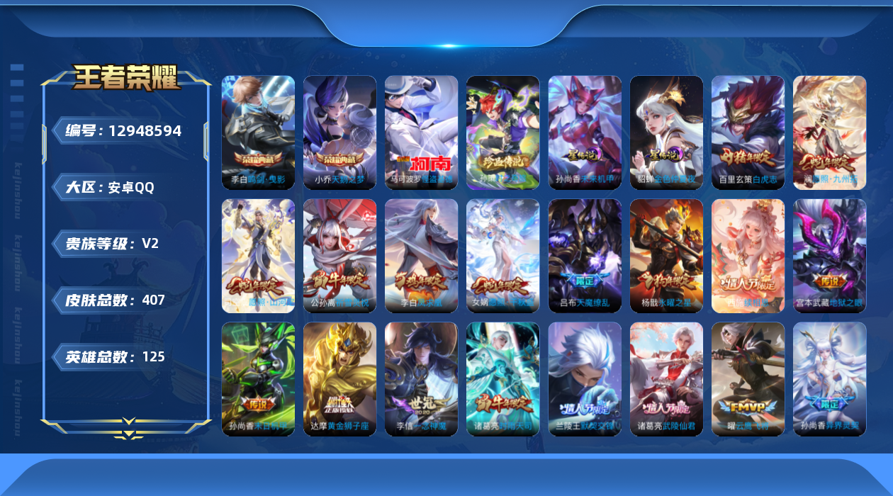 [12948594]【特价急出/详情看图】安卓Q-V2-最强王者段位-124英雄-407皮肤-2典藏-2珍品传说-2星元-39传说-127史诗