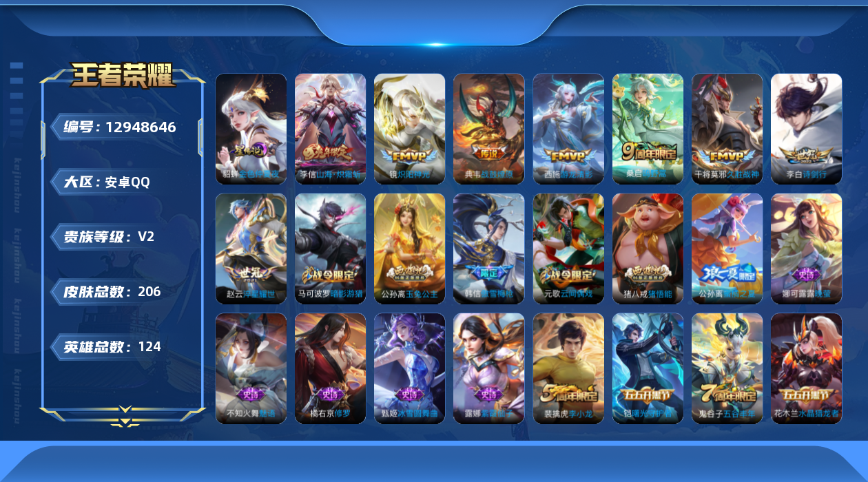 [12948646]【特价急出/详情看图】安卓Q-V2-永恒钻石V段位-124英雄-206皮肤-8传说-62史诗 【传说皮肤】:桑启鸣野蒿,典韦战鼓燎原,李信山海炽霜斩,李白诗剑行,赵云淬星耀世,西施游龙清影,镜炽阳神光,干将莫邪久胜战神 【限定皮肤】:姜子牙天穹之誓,狄仁杰阴阳师,赵云皇家上将,墨子神迹守卫,孙尚香蔷薇恋人,庄周高山流水,高渐离玩趣恶龙,阿轲迷踪丽影,芈月幻夜卜梦,元歌云间偶戏,马可波罗逐梦之星,马可波罗暗影游猎,狄仁杰魔术师,狄仁杰万华元夜,达摩星际陆战队,达摩沙漠行僧,项羽海滩派对,老夫子醍醐杖,老夫子航海奇遇记,程咬金演武夺筹,刘邦夺宝奇兵,韩信傲雪梅枪,兰陵王金庭之子,亚瑟潮玩骑士王,后羿圣弓游侠,李元芳银河之约,李元芳云中旅人,钟馗驱傩正仪,干将莫邪真爱魔法,雅典娜单词大作战,雅典娜黎明之约,太乙真人华丽摇滚,鬼谷子原初探秘者,鬼谷子五谷丰年,黄忠火炮绅士,苏烈千军破阵,弈星混沌棋,公孙离蜜橘之夏,公孙离玉兔公主,沈梦溪星空之诺,沈梦溪大漠名商,明世隐疑决卦,裴擒虎李小龙,裴擒虎擒涛扼浪,米莱狄胡桃异想国,云中君纤云弄巧,李信山海炽霜斩,伽罗天狼溯光者,猪八戒西部大镖客,猪八戒猪悟能,蒙犽狂想玩偶喵,鲁班大师探海日志,镜匿光追影者,桑启海盐诗旅,阿古朵江河有灵,张良古海寻踪,鬼谷子天穹祈灯,沈梦溪龙舞盛年,刘邦剑破天穹,程咬金群星魔术团 【年限皮肤】:李信山海炽霜斩 【赛季限定】:狄仁杰万华元夜,达摩沙漠行僧,老夫子醍醐杖,程咬金演武夺筹,兰陵王金庭之子,张良古海寻踪,李元芳云中旅人,钟馗驱傩正仪,雅典娜黎明之约,鬼谷子原初探秘者,苏烈千军破阵,弈星混沌棋,沈梦溪大漠名商,明世隐疑决卦,裴擒虎擒涛扼浪,鲁班大师探海日志,桑启海盐诗旅,鬼谷子天穹祈灯,刘邦剑破天穹,姜子牙天穹之誓 【战令限定】:墨子神迹守卫,阿轲迷踪丽影,芈月幻夜卜梦,元歌云间偶戏,马可波罗暗影游猎,达摩星际陆战队,老夫子航海奇遇记,刘邦夺宝奇兵,亚瑟潮玩骑士王,后羿圣弓游侠,李元芳银河之约,干将莫邪真爱魔法,雅典娜单词大作战,黄忠火炮绅士,沈梦溪星空之诺,米莱狄胡桃异想国,猪八戒西部大镖客,蒙犽狂想玩偶喵 【史诗皮肤】:露娜紫霞仙子,赵云皇家上将,赵云未来纪元,貂蝉圣诞恋歌,甄姬冰雪圆舞曲,狄仁杰魔术师,宫本武藏鬼剑武藏,孙尚香蔷薇恋人,孙尚香水果甜心,妲己魅力维加斯,墨子龙骑士,墨子金属