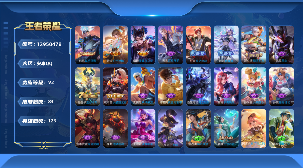 [12950478]【特价急出/详情看图】:安卓Q-V2-最强王者段位-123英雄-83皮肤-1典藏-2传说-16史诗