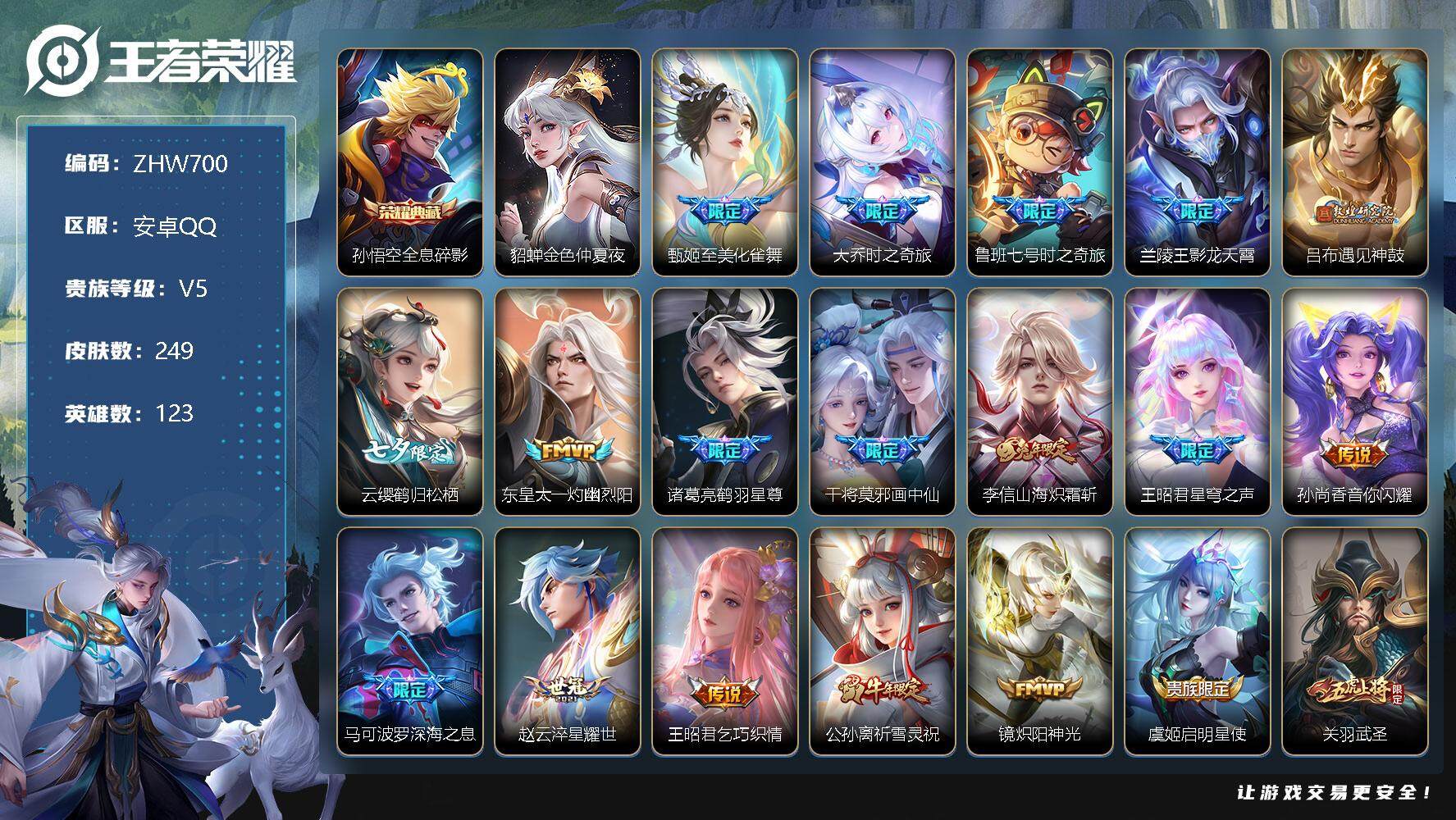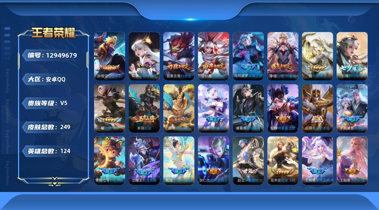 [12949679]【特价急出/详情看图】安卓Q-V5-尊贵铂金I段位-123英雄-249皮肤-1典藏-25传说-62史诗 【荣耀典藏】:孙悟空全息碎影 【传说皮肤】:甄姬至美化雀舞,大乔时之奇旅,鲁班七号时之奇旅,兰陵王影龙天霄,吕布遇见神鼓,云缨鹤归松栖,东皇太一灼幽烈阳,诸葛亮鹤羽星尊,干将莫邪画中仙,李信山海炽霜斩,王昭君星穹之声,孙尚香音你闪耀,马可波罗深海之息,赵云淬星耀世,王昭君乞巧织情,公孙离祈雪灵祝,镜炽阳神光,虞姬启明星使,关羽武圣,曜云鹰飞将,百里玄策白虎志,花木兰冠军飞将,后羿黄金射手座,貂蝉仲夏夜之梦,狄仁杰超时空战士 【限定皮肤】:大乔绒语心约,姜子牙天穹之誓,狄仁杰阴阳师,赵云皇家上将,妲己热情桑巴,嬴政优雅恋人,孙尚香蔷薇恋人,鲁班七号时之奇旅,庄周高山流水,阿轲迷踪丽影,芈月幻夜卜梦,吕布遇见神鼓,元歌无心,夏侯惇朔风刀,甄姬至美化雀舞,典韦穷奇,马可波罗暗影游猎,马可波罗深海之息,马可波罗山海玄木吟,狄仁杰魔术师,狄仁杰万华元夜,达摩沙漠行僧,项羽海滩派对,老夫子醍醐杖,关羽武圣,程咬金演武夺筹,刘邦夺宝奇兵,韩信傲雪梅枪,王昭君星穹之声,兰陵王影龙天霄,兰陵王金庭之子,花木兰青春决赛季,孙悟空至尊宝,孙悟空大圣娶亲,牛魔御旌,张飞虎魄,李元芳匿光侦查者,李元芳云中旅人,虞姬启明星使,钟馗驱傩正仪,杨玉环遇见飞天,女娲朔望之晖,干将莫邪画中仙,雅典娜单词大作战,鬼谷子原初探秘者,鬼谷子五谷丰年,诸葛亮鹤羽星尊,大乔时之奇旅,黄忠火炮绅士,苏烈千军破阵,百里玄策白虎志,百里守约朱雀志,弈星混沌棋,公孙离祈雪灵祝,沈梦溪大漠名商,明世隐疑决卦,裴擒虎李小龙,裴擒虎擒涛扼浪,狂铁御狮,米莱狄御霄,云中君纤云弄巧,李信山海炽霜斩,盾山御銮,猪八戒西部大镖客,上官婉儿梁祝,上官婉儿天狼绘梦者,嫦娥暖冬兔眠,西施玲珑珍味,西施至美乘鲤谣,蒙犽狂想玩偶喵,鲁班大师探海日志,桑启海盐诗旅,暃星界游侠,艾琳流音漫舞,赵怀真鹤归松栖,云缨鹤归松栖,司空震地狱燃心,阿古朵江河有灵,张良古海寻踪,鬼谷子天穹祈灯,刘邦剑破天穹,周瑜熔金海岸 【年限皮肤】:百里玄策白虎志,百里守约朱雀志,公孙离祈雪灵祝,马超神威,关羽武圣,张飞虎魄,马可波罗山海玄木吟,李信山海炽霜斩 【赛季限定】:夏侯惇朔风刀,典韦穷奇,狄仁杰万华元夜,达摩沙漠行僧,老夫子醍醐杖,程咬金演武夺筹,兰陵王金庭