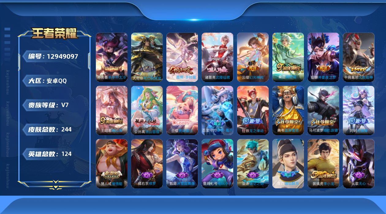 [12949097]【特价急出/详情看图】:安卓Q-V7-最强王者段位-124英雄-244皮肤-1典藏-9传说-64史诗