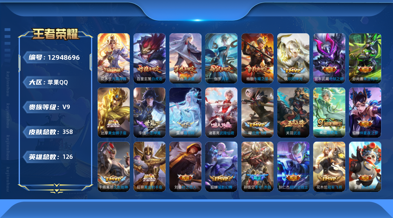 [12948696]苹果Q-V9-永恒钻石III段位-126英雄-358皮肤-1典藏-27传说-111史诗