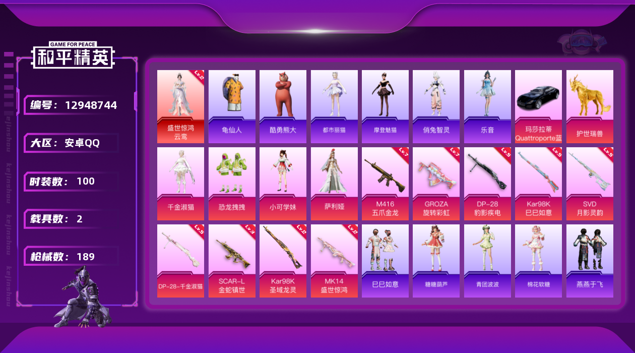 [12948744]【特价急出/详情看图】:安卓 手Q-1红装-5粉装-9特效枪-2载具-8粉色飞行器-6.1w热力值-9王牌印记-100套装-189枪皮【红色神装等级】:盛世惊鸿-云鸾(二级)【热门品类】:粉装-梦幻火箭,套装-龟仙人【粉色载具】:玛莎拉蒂Quattroporte(夜幕蓝),护世瑞兽【粉色套装】:粉装-梦幻火箭,粉装-恐龙拽拽,角色-小可学妹,角色-千金淑猫,角色-萨利娅【粉色枪皮等级】:SCAR-L-金蛇镇世(三级),M416-五爪金龙(七级),GROZA-旋转彩虹(七级),Kar98K-巳巳如意(五级),Kar98K-圣域龙灵(二级),Mk14-盛世惊鸿(二级),SVD-月影灵韵(五级),DP-28-千金淑猫(五级),DP-28-豹影疾电(五级)【粉色飞行器】:酣梦熊熊飞行器,梦幻火箭飞行器,镜域双华-灵镜之阶,魔法神域飞行器,凤舞九天飞行器,万象金身飞行器,彩虹独角兽飞行器
