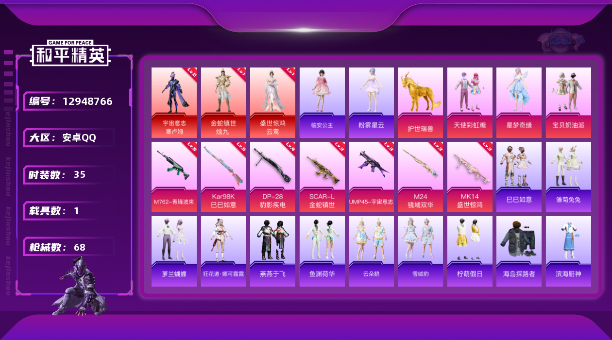 [12948766]【特价急出/详情看图】:安卓 手Q-3红装-4粉装-7特效枪-1载具-6粉色飞行器-2.7w热力值-1王牌印记-35套装-68枪皮【红色神装等级】:金蛇镇世-烛九(一级),盛世惊鸿-云鸾(一级),宇宙意志-塞卢姆(二级)【粉色载具】:护世瑞兽【粉色套装】:粉装-宝贝奶油派,粉装-天使彩虹糖,角色-星梦奇缘【粉色枪皮等级】:SCAR-L-金蛇镇世(三级),M762-青锋波束(五级),UMP45-宇宙意志(三级),Kar98K-巳巳如意(五级),M24-镜域双华(三级),Mk14-盛世惊鸿(三级),DP-28-豹影疾电(四级)【粉色飞行器】:酣梦熊熊飞行器,龙翔九天飞行器,深渊漩涡飞行器,凤舞九天飞行器,万象金身飞行器