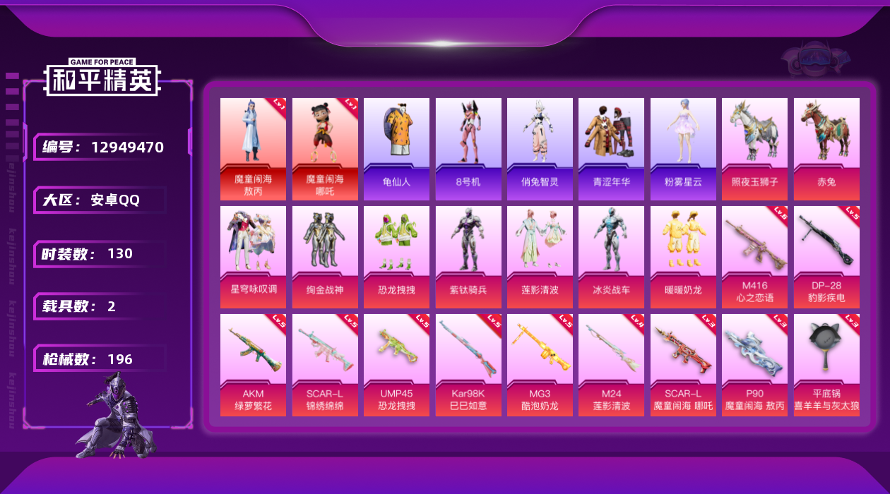 [12949470]素材身法号/地铁满天赋【特价急出/详情看图】:安卓 手Q-2神装-7粉装-11特效枪-2载具-4粉色飞行器-6.7w热力值-11王牌印记-130套装-196枪皮【红色神装等级】:魔童闹海-敖丙(一级),魔童闹海-哪吒(一级)【热门品类】:套装-深海小丑鱼,角色-忠猛周仓,角色-忠真马岱,角色-忠义严颜,套装-龟仙人,角色-8号机,大砍刀-青龙偃月刀,撬棍-龙胆亮银枪【粉色载具】:赤兔,照夜玉狮子【粉色套装】:粉装-绚金战神,粉装-恐龙拽拽,粉装-莲影清波,粉装-暖暖奶龙,角色-冰炎战车,角色-紫钛骑兵,粉装-星穹咏叹调【粉色枪皮等级】:AKM-绿萝繁花(五级),SCAR-L-锦绣绵绵(五级),SCAR-L-魔童闹海 哪吒(三级),M416-心之恋语(六级),UMP45-恐龙拽拽(五级),P90-魔童闹海 敖丙(三级),Kar98K-巳巳如意(五级),M24-莲影清波(四级),DP-28-豹影疾电(五级),MG3-酷泡奶龙(五级),平底锅-喜羊羊与灰太狼(三级)【粉色飞行器】:熔岩统帅飞行器,沙丘之主天马,灵珠游龙飞行器