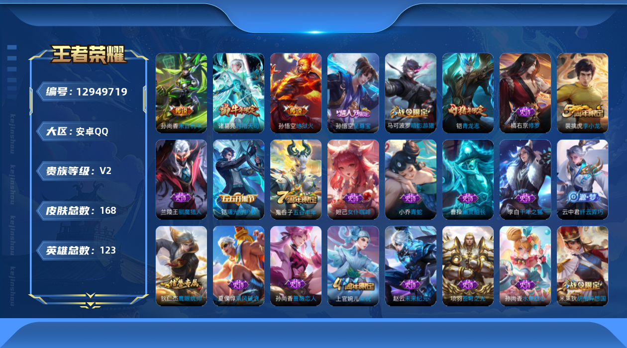 [12949719]【特价急出/详情看图】:安卓Q-V2-至尊星耀I段位-123英雄-168皮肤-3传说-33史诗