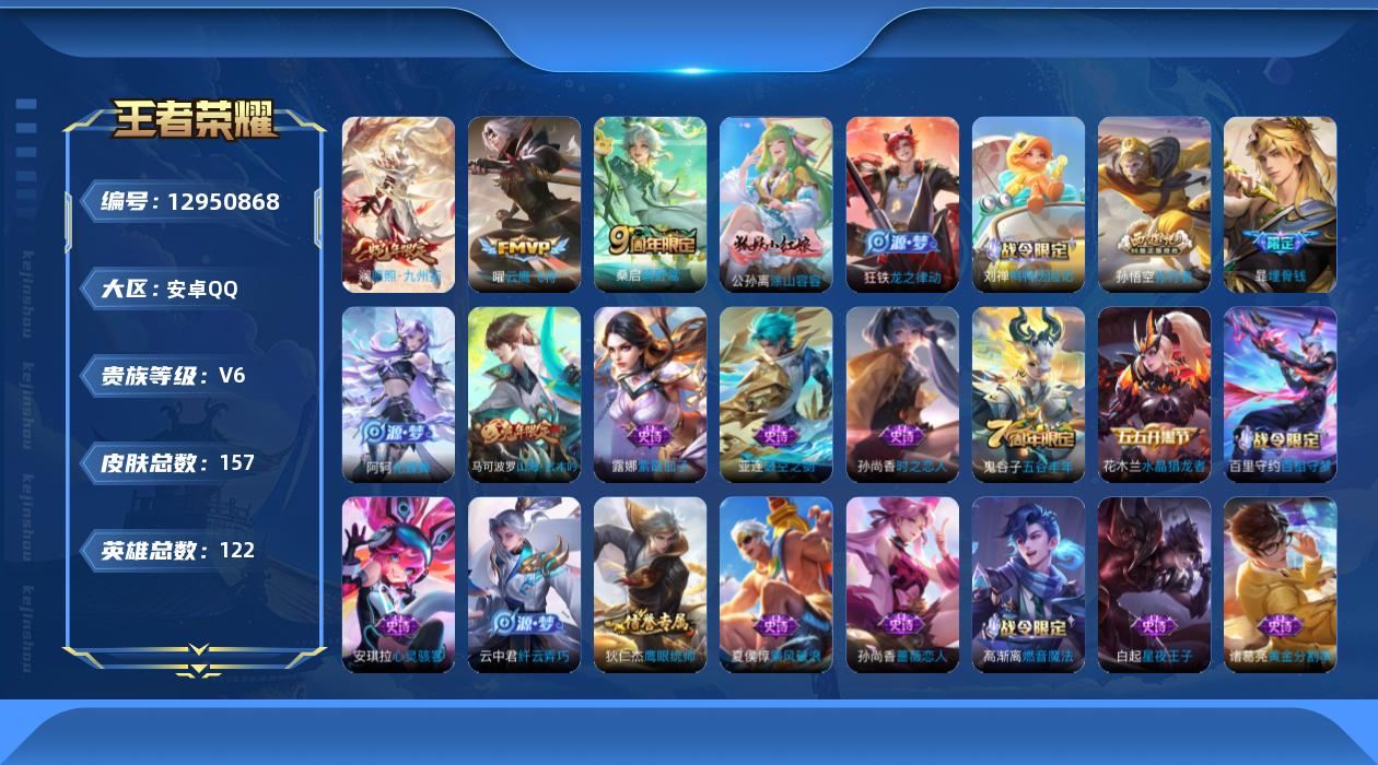 - PX_2026995-贵族7/皮肤201/传说9/史诗56/英雄123/特工战影/冠军飞将/一念神魔/绛天战甲/寅虎赤拳/逐花归海/乘龙淬吴钩/桑启鸣野蒿/云缨幻光神枪/司空震愿照山河定/蒙犽顽岩魄/蔡文姬夏日便利店/虞姬夏日便利店/姜子牙天穹之誓/杨戬破阵退雄兵/狄仁杰阴阳师/赵云皇家上将/扁鹊奇幻香踪/白起夜都怪侠/猎兽之王/元歌无心/蓝屏警告/岱宗/山海玄木吟/狄仁杰魔术师/项羽海滩派对/关