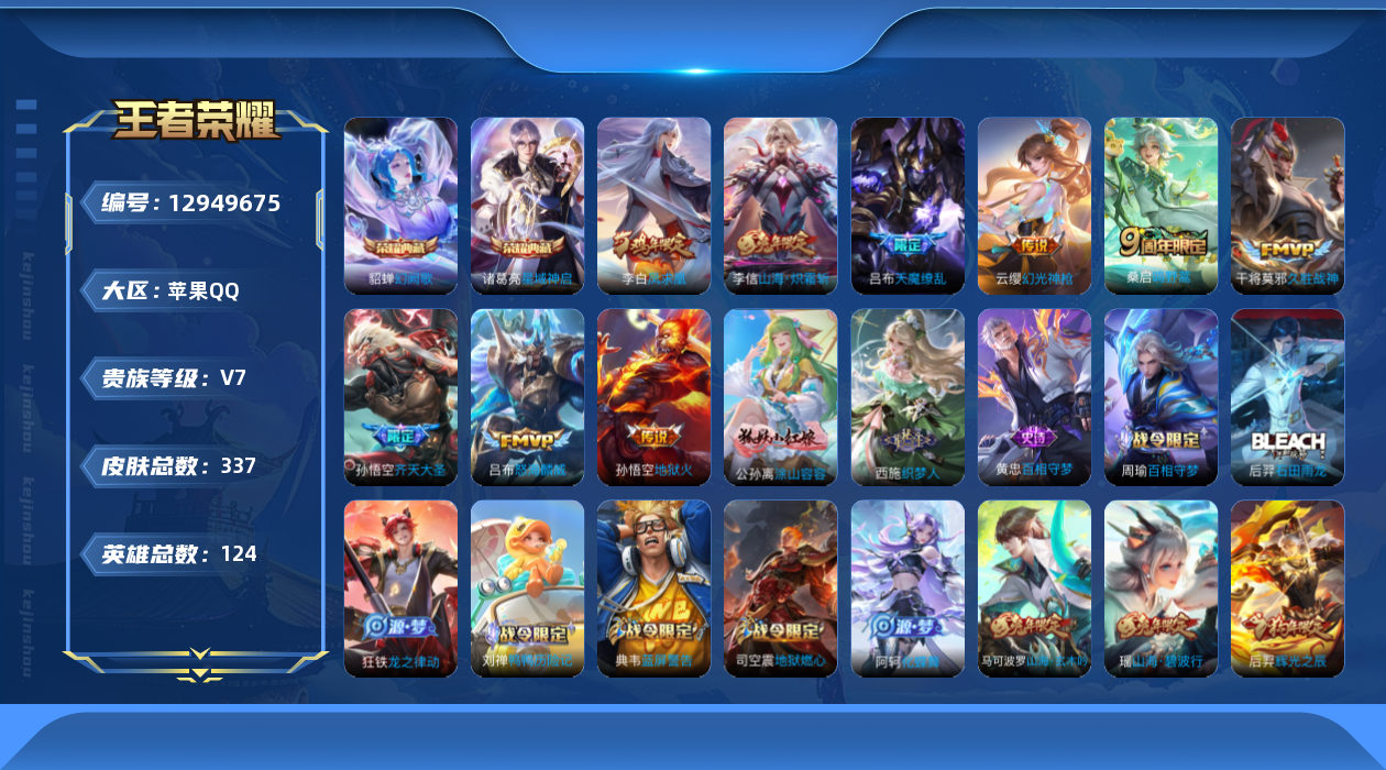 [12949675]【特价急出/详情看图】:苹果Q-V7-最强王者段位-124英雄-337皮肤-2典藏-9传说-94史诗 【荣耀典藏】:诸葛亮星域神启,貂蝉幻阙歌 【传说皮肤】:云缨幻光神枪,桑启鸣野蒿,孙悟空齐天大圣,李信山海炽霜斩,吕布怒海麟威,干将莫邪久胜战神,李白凤求凰,孙悟空地狱火,吕布天魔缭乱 【限定皮肤】:蒙犽顽岩魄,蔡文姬夏日便利店,大乔绒语心约,虞姬夏日便利店,姜子牙天穹之誓,杨戬破阵退雄兵,狄仁杰阴阳师,赵云皇家上将,赵云龙胆,高渐离死亡摇滚,阿轲迷踪丽影,扁鹊奇幻香踪,芈月重明,吕布天魔缭乱,元歌无心,夏侯惇朔风刀,甄姬游园惊梦,曹操烛龙,典韦穷奇,典韦蓝屏警告,马可波罗山海玄木吟,狄仁杰魔术师,狄仁杰万华元夜,达摩沙漠行僧,项羽海滩派对,老夫子醍醐杖,程咬金演武夺筹,王昭君午后时光,兰陵王金庭之子,孙悟空齐天大圣,牛魔御旌,后羿辉光之辰,李元芳银河之约,李元芳云中旅人,杨戬潮玩骑兵,干将莫邪胡桃夹子,鬼谷子原初探秘者,鬼谷子五谷丰年,百里玄策原初追逐者,百里守约朱雀志,弈星混沌棋,梦奇顽趣,沈梦溪星空之诺,沈梦溪大漠名商,明世隐疑决卦,裴擒虎李小龙,裴擒虎擒涛扼浪,狂铁御狮,狂铁电玩高手,米莱狄御霄,瑶山海碧波行,云中君纤云弄巧,李信山海炽霜斩,盾山御銮,上官婉儿梁祝,嫦娥拒霜思,嫦娥暖冬兔眠,西施玲珑珍味,鲁班大师探海日志,桑启海盐诗旅,暃星界游侠,戈娅驭风魔法,艾琳流音漫舞,司空震地狱燃心,阿古朵江河有灵,张良古海寻踪,蒙犽百解令,蒙恬荣光圣徽,高渐离燃音魔法,妲己灵卜魔法,鬼谷子天穹祈灯,伽罗琥珀纪元,姬小满妄想食味,沈梦溪龙舞盛年,鲁班七号蔬乡物语,李元芳蔬乡物语,刘邦剑破天穹,上官婉儿群星魔术团,程咬金群星魔术团,镜青焰无极,项羽苍威无极,刘备异域游侠,周瑜熔金海岸 【年限皮肤】:百里守约朱雀志,李白凤求凰,后羿辉光之辰,赵云龙胆,瑶山海碧波行,马可波罗山海玄木吟,李信山海炽霜斩 【赛季限定】:芈月重明,夏侯惇朔风刀,曹操烛龙,典韦穷奇,狄仁杰万华元夜,达摩沙漠行僧,老夫子醍醐杖,程咬金演武夺筹,兰陵王金庭之子,张良古海寻踪,牛魔御旌,李元芳云中旅人,鬼谷子原初探秘者,百里玄策原初追逐者,弈星混沌棋,梦奇顽趣,沈梦溪大漠名商,明世隐疑决卦,裴擒虎擒涛扼浪,狂铁御狮,米莱狄御霄,盾山御銮,鲁班大师探海日志,桑启海盐诗旅,鬼谷子天穹祈灯,蒙恬荣光圣徽,刘