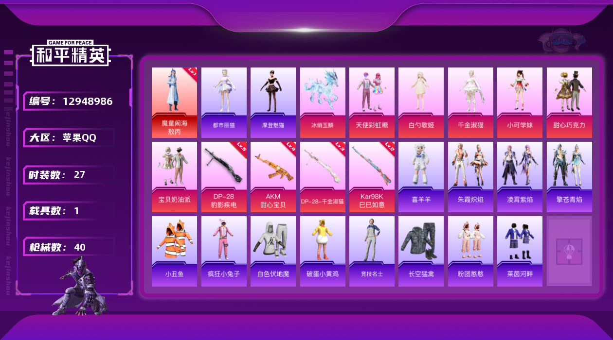 [12948986]【特价急出/详情看图】:苹果 手Q-1神装-6粉装-4特效枪-1载具-3粉色飞行器-1.5w热力值-1王牌印记-27套装-40枪皮【红色神装等级】:魔童闹海-敖丙(一级)【热门品类】:套装-小丑鱼【粉色载具】:冰绡玉鳞【粉色套装】:粉装-甜心巧克力,粉装-宝贝奶油派,粉装-天使彩虹糖,角色-白勺歌姬,角色-小可学妹,角色-千金淑猫【粉色枪皮等级】:AKM-甜心宝贝(四级),Kar98K-巳巳如意(二级),DP-28-千金淑猫(三级),DP-28-豹影疾电(五级)【粉色飞行器】:飞天猪飞行器,灵珠游龙飞行器