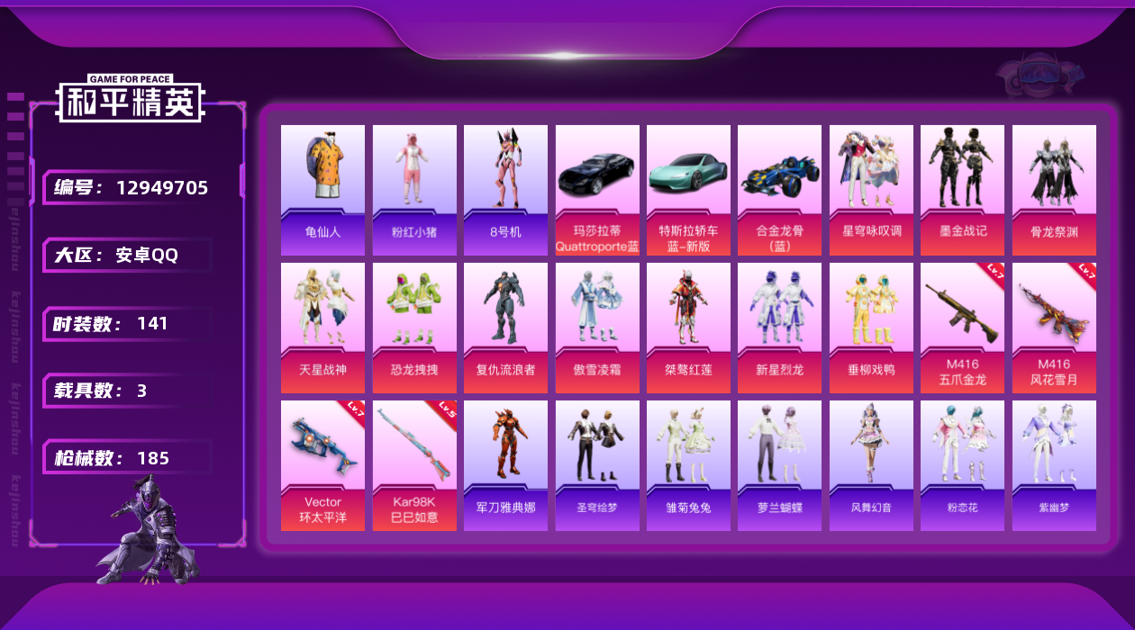 [12949705]素材身法号【特价急出/详情看图】:安卓 手Q-11粉装-4特效枪-3载具-5粉色飞行器-7w热力值-9王牌印记-141套装-185枪皮【热门品类】:粉装-梦幻火箭,角色-军刀雅典娜,套装-龟仙人,套装-粉红小猪,角色-8号机【粉色载具】:特斯拉Roadster(水滴蓝),玛莎拉蒂Quattroporte(夜幕蓝),合金龙骨(蓝)【粉色套装】:粉装-梦幻火箭,粉装-新星烈龙,粉装-桀骜红莲,粉装-骨龙祭渊,粉装-恐龙拽拽,角色-复仇流浪者,粉装-傲雪凌霜,粉装-垂柳戏鸭,粉装-天星战神,粉装-墨金战记,粉装-星穹咏叹调【粉色枪皮等级】:M416-五爪金龙(七级),M416-风花雪月(七级),Vector-环太平洋(七级),Kar98K-巳巳如意(五级)【粉色飞行器】:绒雪飘舞飞行器,千面幻镜飞行器,变形金刚飞行器,繁龙极客飞行器,时光之誓飞行器