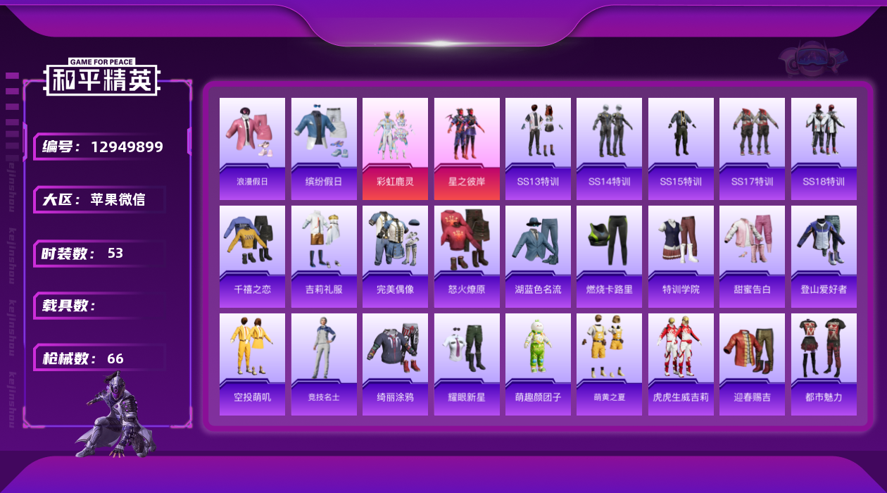 - [12235112]8粉装 3特效枪 1载具 10印记 可二次 可修改实名 设备脸 优质装备:幽澜尊爵(静谧蓝),千金淑猫,伏羲圣卦,彩虹独角兽,桃粉嫣然,智耀战神,AKS-74U-星穹咏叹调,Kar98K-巳巳如意 热门装扮:幻影,创世·救赎,风幻水境,神秘黑猫 稀有枪皮:DP-28-豹影疾电 五级特效枪:五级Kar98K-巳巳如意,五级DP-28-豹影疾电,五级AKS-74U-星穹咏叹调 紫色装扮:SS31特训套装,人气偶像,冷焰舞者,霓虹热舞,SS30特训套装,云朵鹅,雪绒豹,SS33特训套装,顶瓜瓜,豚鼠丹丹,竞技角斗士,吉莉礼服,都市魅力,酒红色名流,酷潮明星,酷萌兔限定,长空猛禽,霓虹街区,青年教官,缤纷果语,蓝彩潮人,蓝色运动,街头潮人,魅力单车,鹤鸣,黄色伏地魔,黄色名流,黄色运动,黎明保卫者,黑色伏地魔,龙的传人,龟仙人,冰河战士,龙魂突击队,蝶变,极速红龙,橘黑制服,涂山之恋,深蓝色名流,幻影武者,坚韧舞者,完美偶像,帅气教官,战地督导,湖蓝色名流,绮丽涂鸦,疯狂小兔子,白色伏地魔,破晓战魂,破蛋小黄鸡,甜蜜告白,空岛之星,竞技达人朋克,红色运动,灰色格斗者,灼焰舞者,猛禽,猎鹰,小熊娃娃,雏菊兔兔,萝兰蝴蝶,SS29特训,先驱飞行员,湖畔霞光,星途旅人,纯真浪花,热情海星,曼妙人鱼,SS28特训,异域银装,石蕴玉辉,鱼渊荷华,玉兔迎春,燕燕于飞,巳巳如意,都市丽猫,青团波波,糖糖葫芦,棉花软糖,竞技名士,果汁能量,惊鸿侠骨,甜梦熊熊,神气柴柴,懵萌河马,SS24特训(SS24特训套装),SS25特训,绝对偶像,锦衣飞扬,焰鹰斗篷,幻羽潜行,SS27特训,无暇誓言,SS26特训,春光漫游,快闪甜心,贝斯之夜,大橘大利,星渊小夜曲,耀粉歌者,粉恋花,蓝冰羽,紫幽梦,SS32特训服(SS32特训套装),萌萌史莱姆,青玉碎影,绯格组合,樱梦幻音,白糯汤圆,糖霜甜心,蜜桃派对,恋语绒绒,光之冒险 优质战备:守护天翼降落伞,拳皇·狂花道降落伞,未来领航者降落伞,英伦信使飞行器,金丰海韵降落伞,恐龙拽拽降落伞,绯穹魔姬降落伞,月影灵韵降落伞,智耀战神降落伞,雪月幻音降落伞,彩虹独角兽飞行器,樱桃泡泡降落伞,彩虹独角兽降落伞,天星战神降落伞,梦幻火箭降落伞,神秘黑猫降落伞,梦之光华降落伞