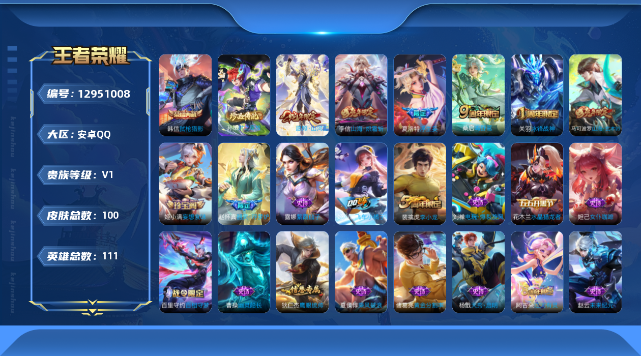 [12951008]【特价急出/详情看图】:安卓Q-V0-永恒钻石IV段位-111英雄-100皮肤-1典藏-1珍品传说-4传说-29史诗