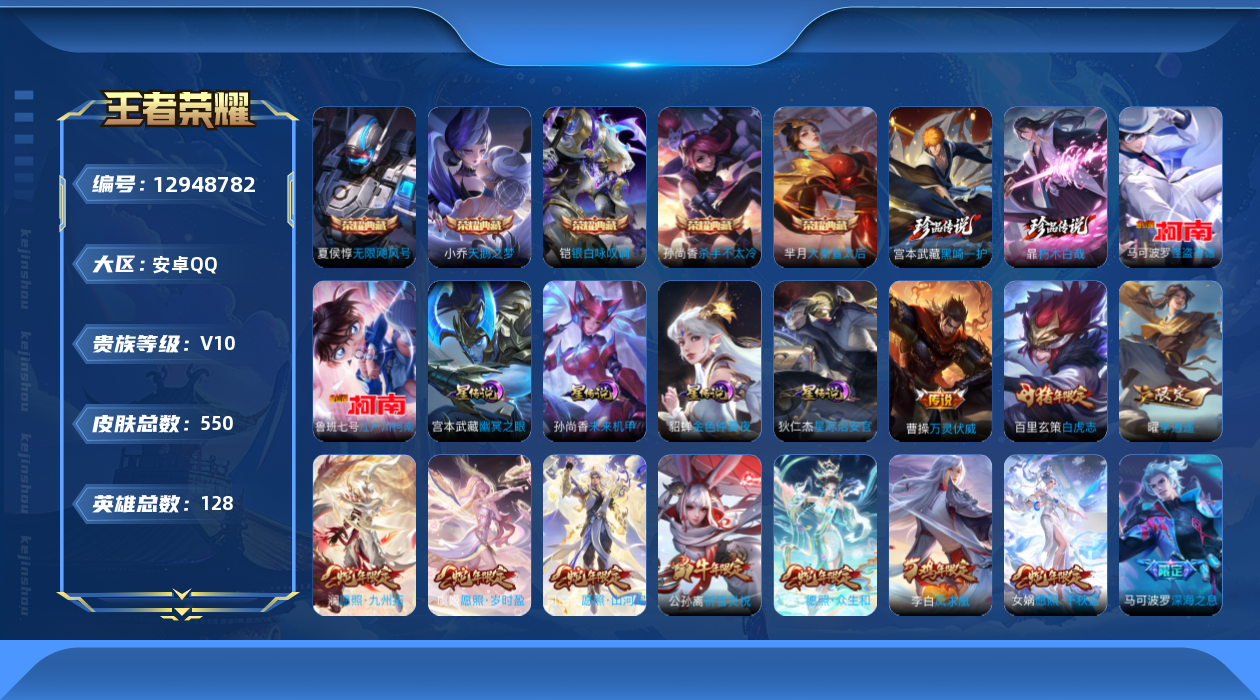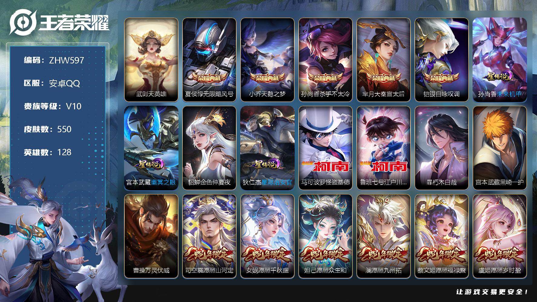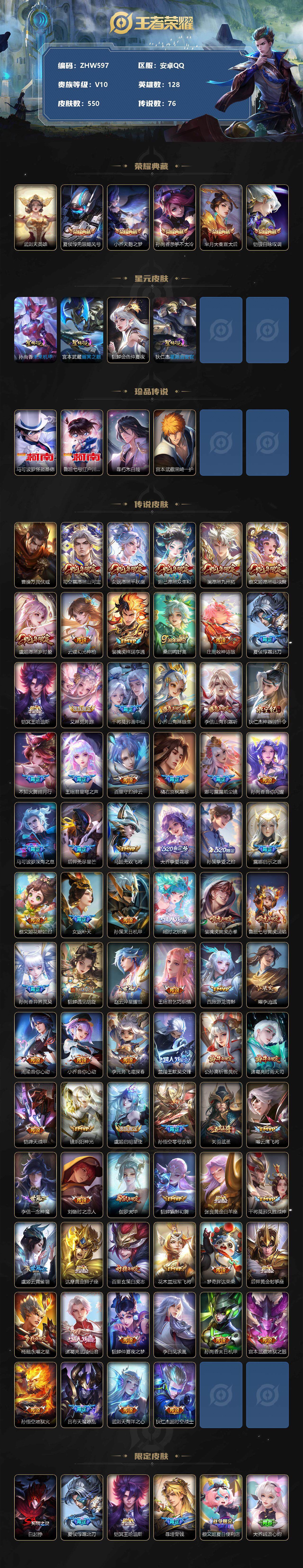[12948782]【特价急出/详情看图】安卓Q-V10-至尊星耀II段位-128英雄-550皮肤-5典藏-4星元-4珍品传说-76传说-188史诗